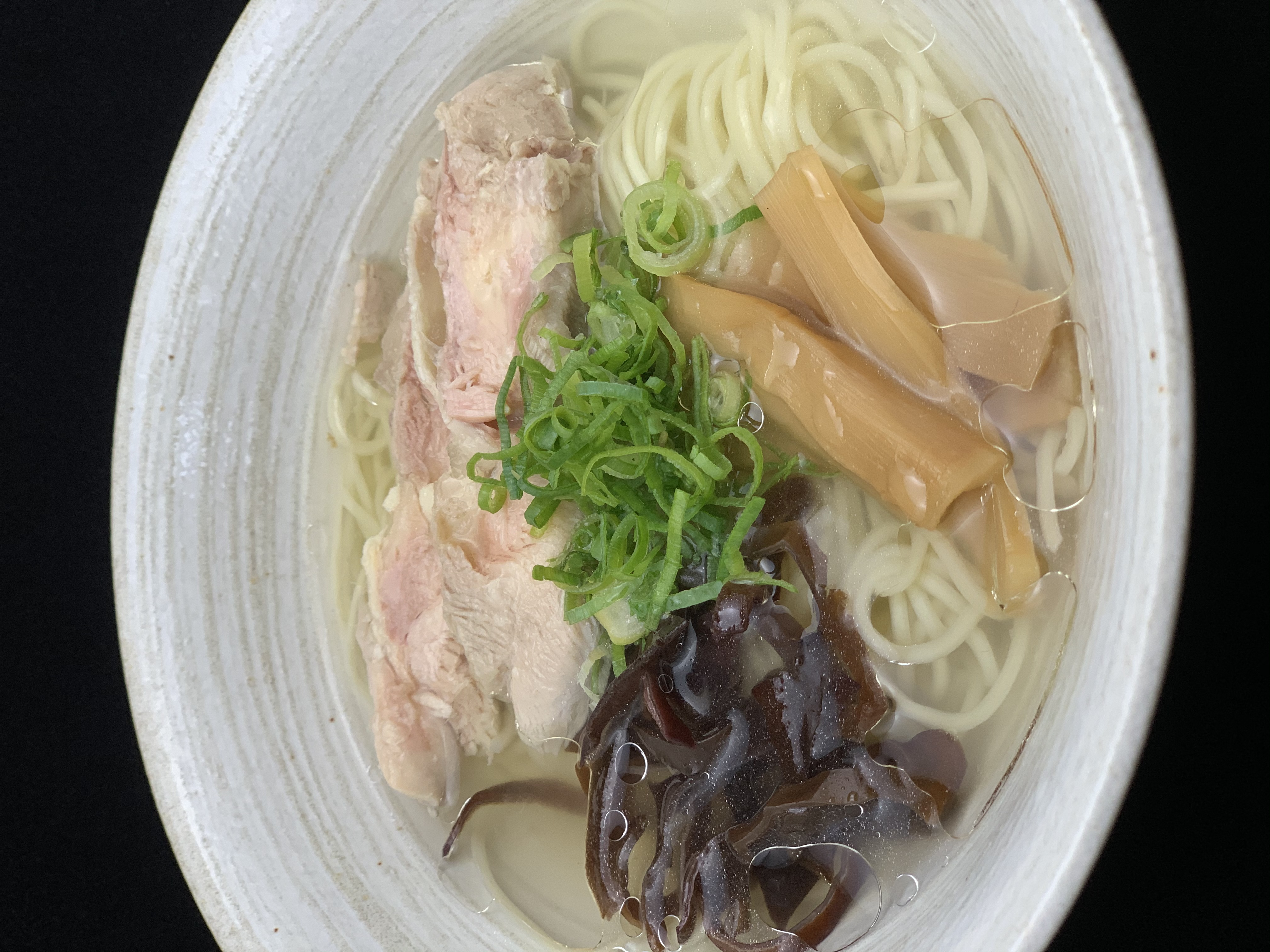 徳島県産鶏からじっくり取り出した透明なスープをベースに鳴門塩で味付けした当店自慢のらーめん