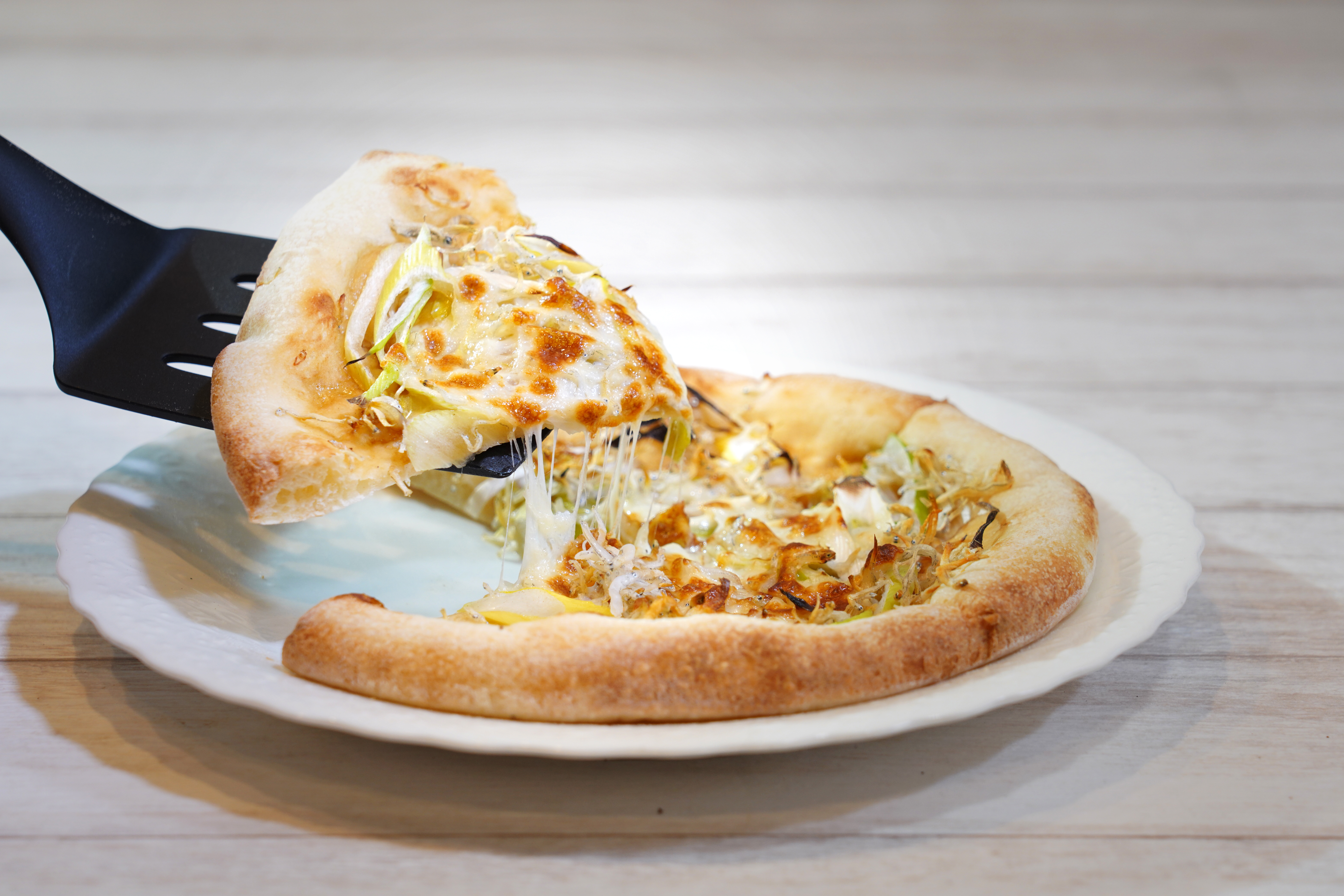 季節限定、矢切ネギとシラスのピザ
