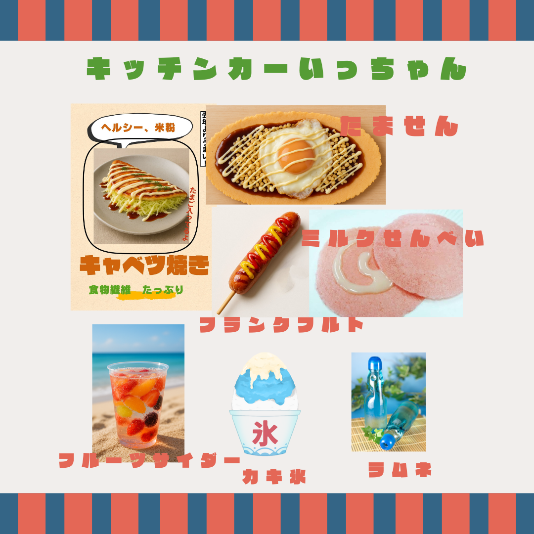 キャベツ焼、たません、ミルクせんべい、フルーツサイダー