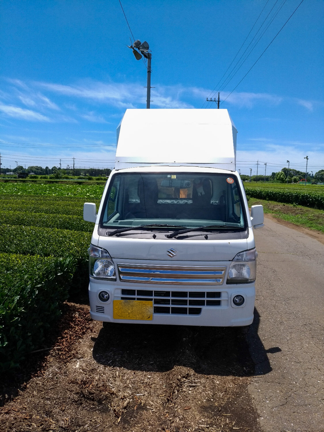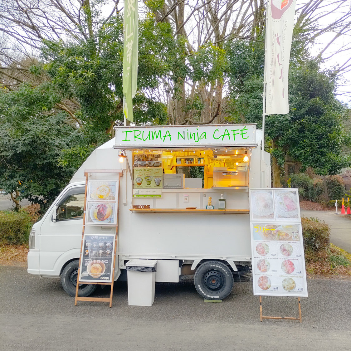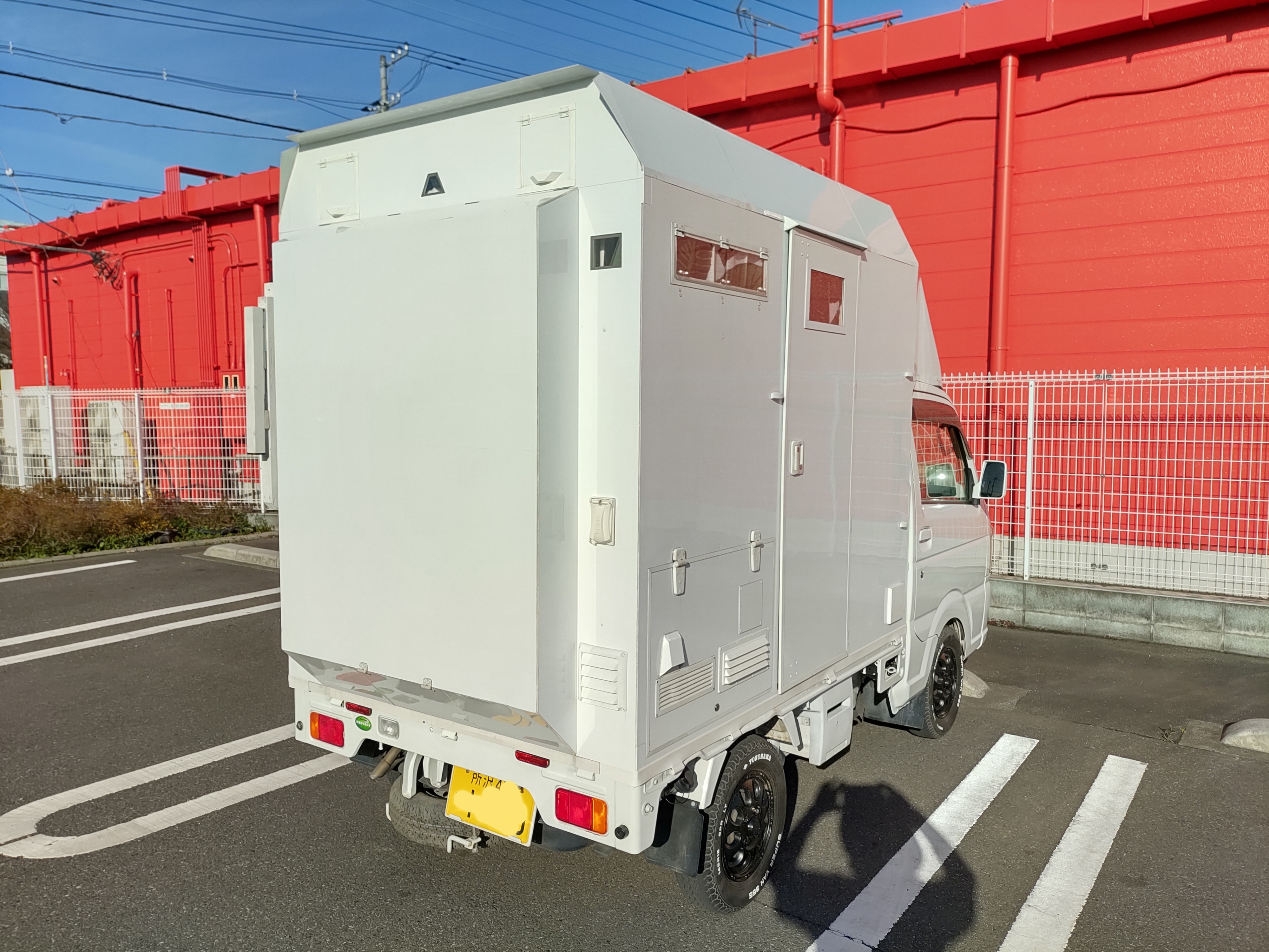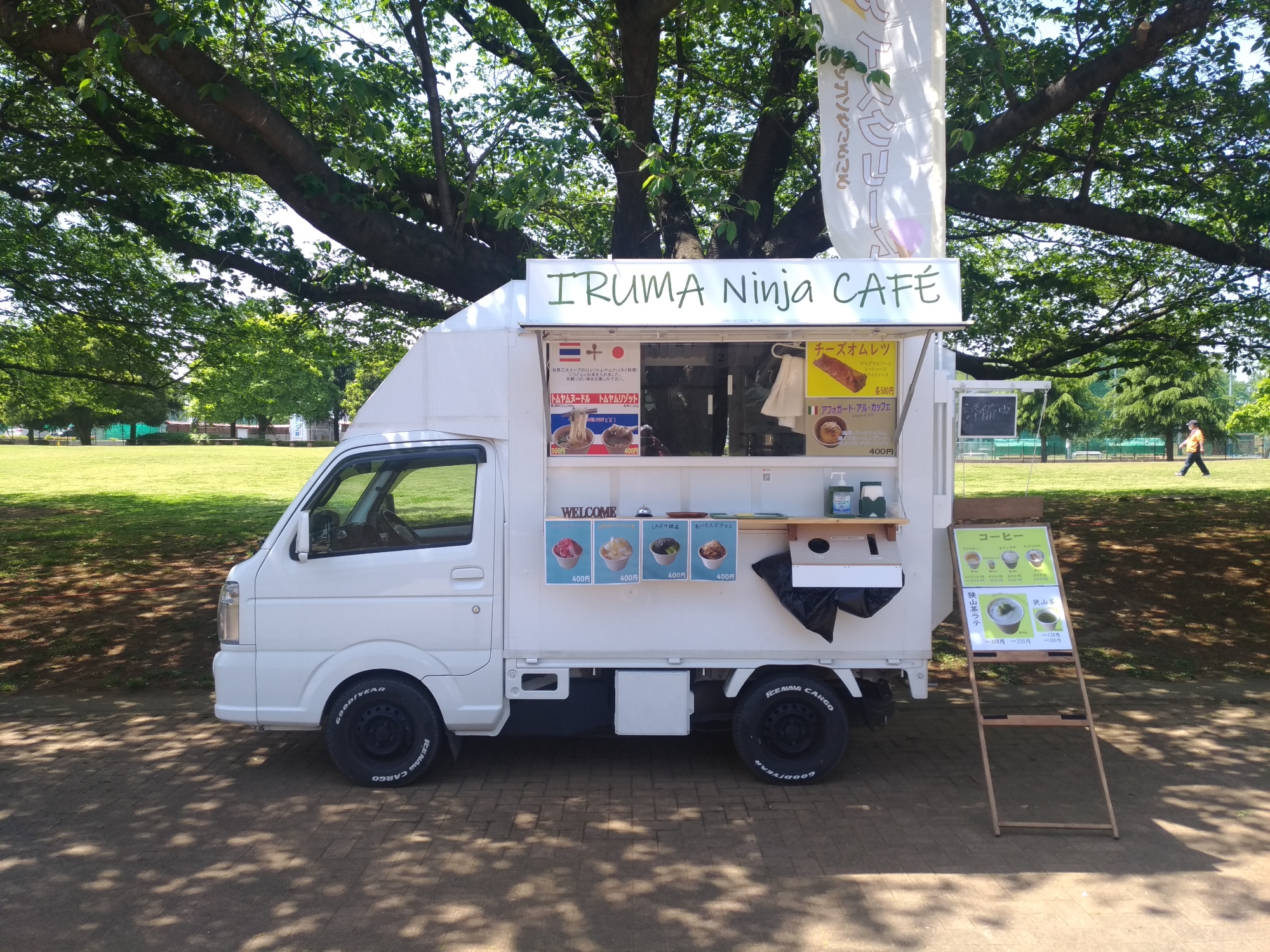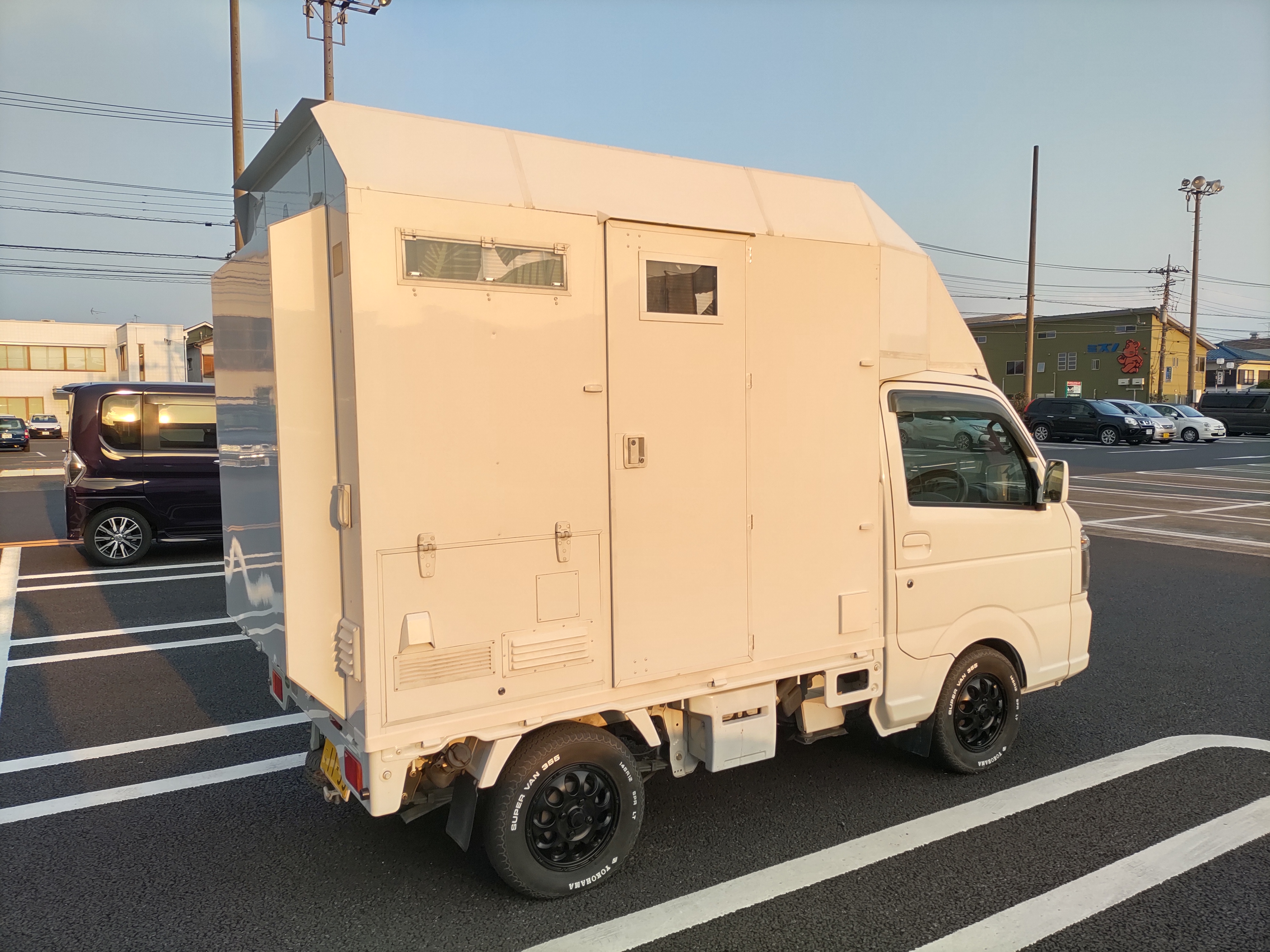 白基調で清潔感のあるスッキリしたデザインの自作キッチンカーです。今のところ派手さはありませんがその分多くの場所にしっくりと馴染みます。夜間は綺麗にライトアップいたします。