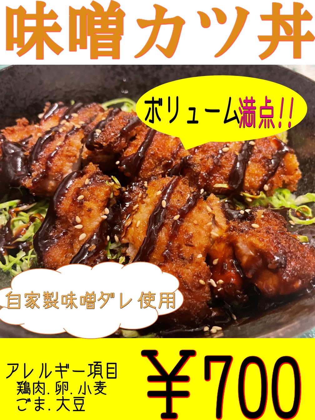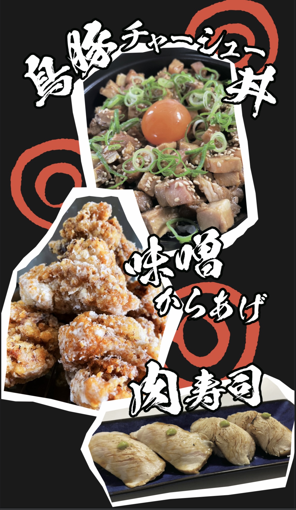 チャーシュー丼、味噌カツ丼、からあげ丼、サムギョプサル丼、唐揚げ、肉寿司、カレー、モツ煮、冷麺