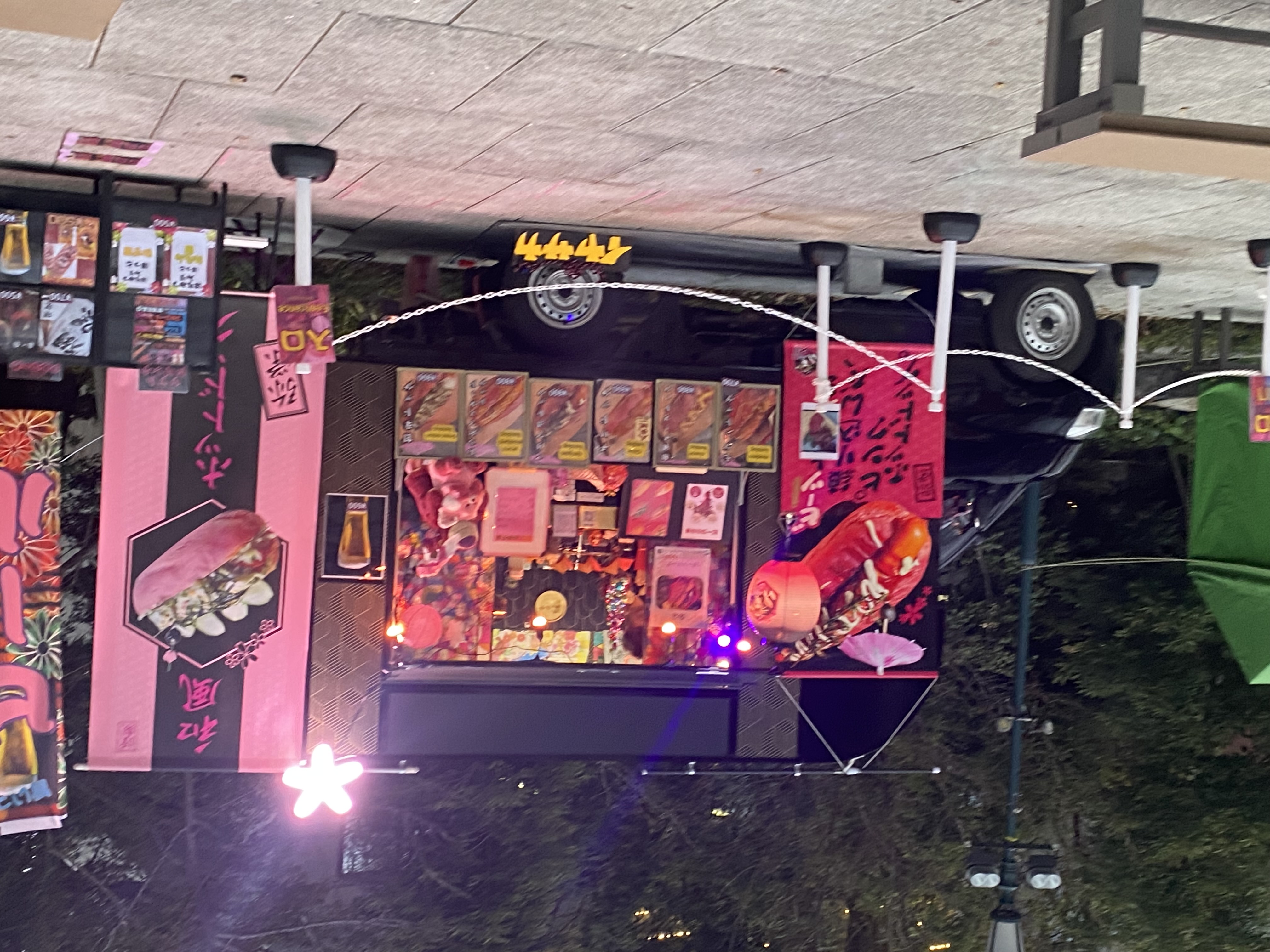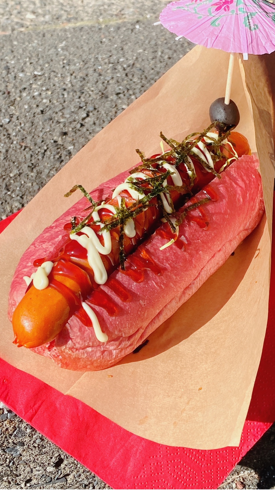 ホットドッグのピンク色なバンズは、九州のグラハム粉を使用したビーツと紫芋を練りこんだフワフワな食感。極太ソーセージ、リングイッサは肉汁滴る食べ応えある逸品です。和テイストは花魁をイメージしています。