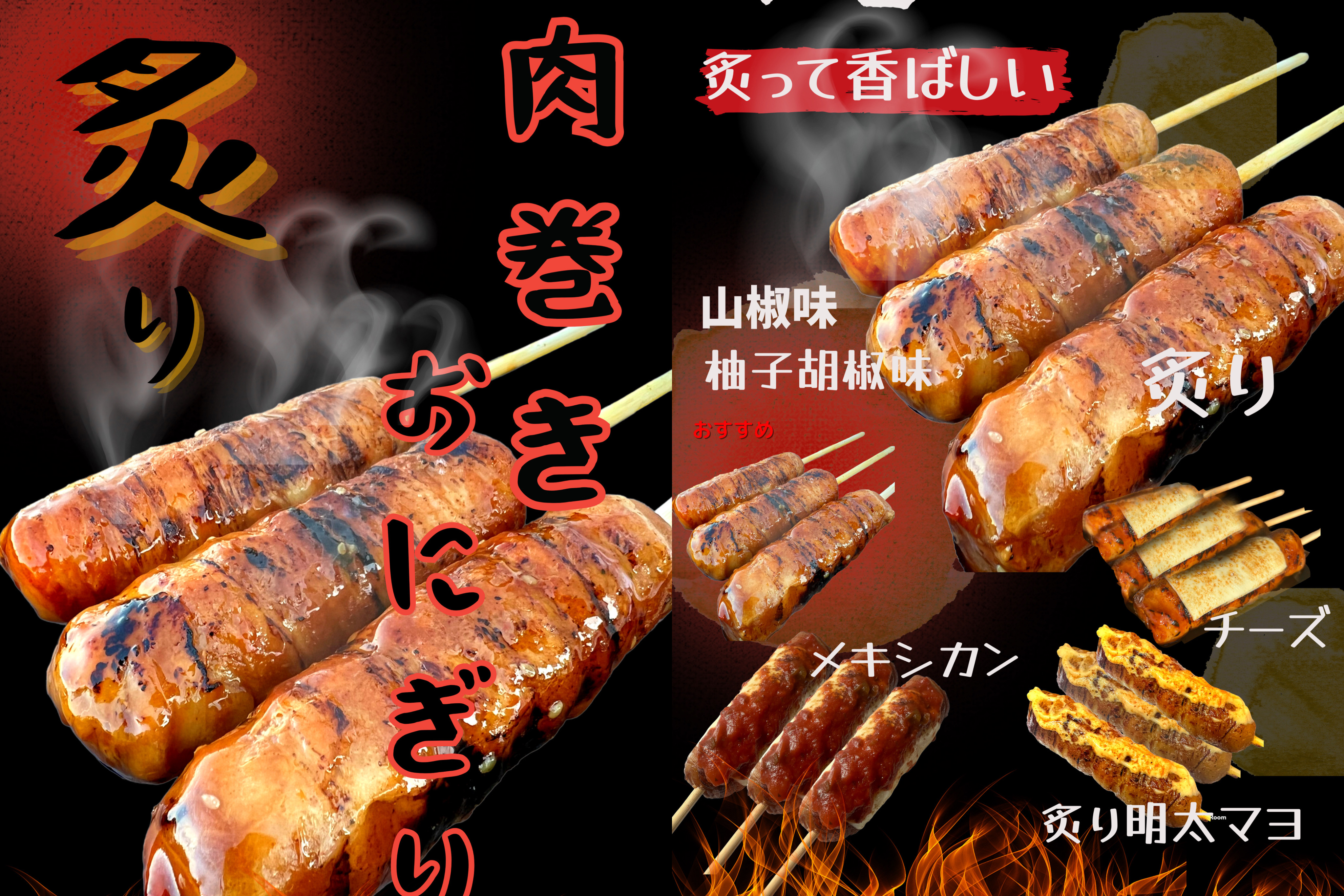 炙り肉巻きおにぎりをはじめ、人気のチーズ肉巻きおにぎり、柚子胡椒や山椒も人気です。新作の明太子マヨ炙りも是非。
