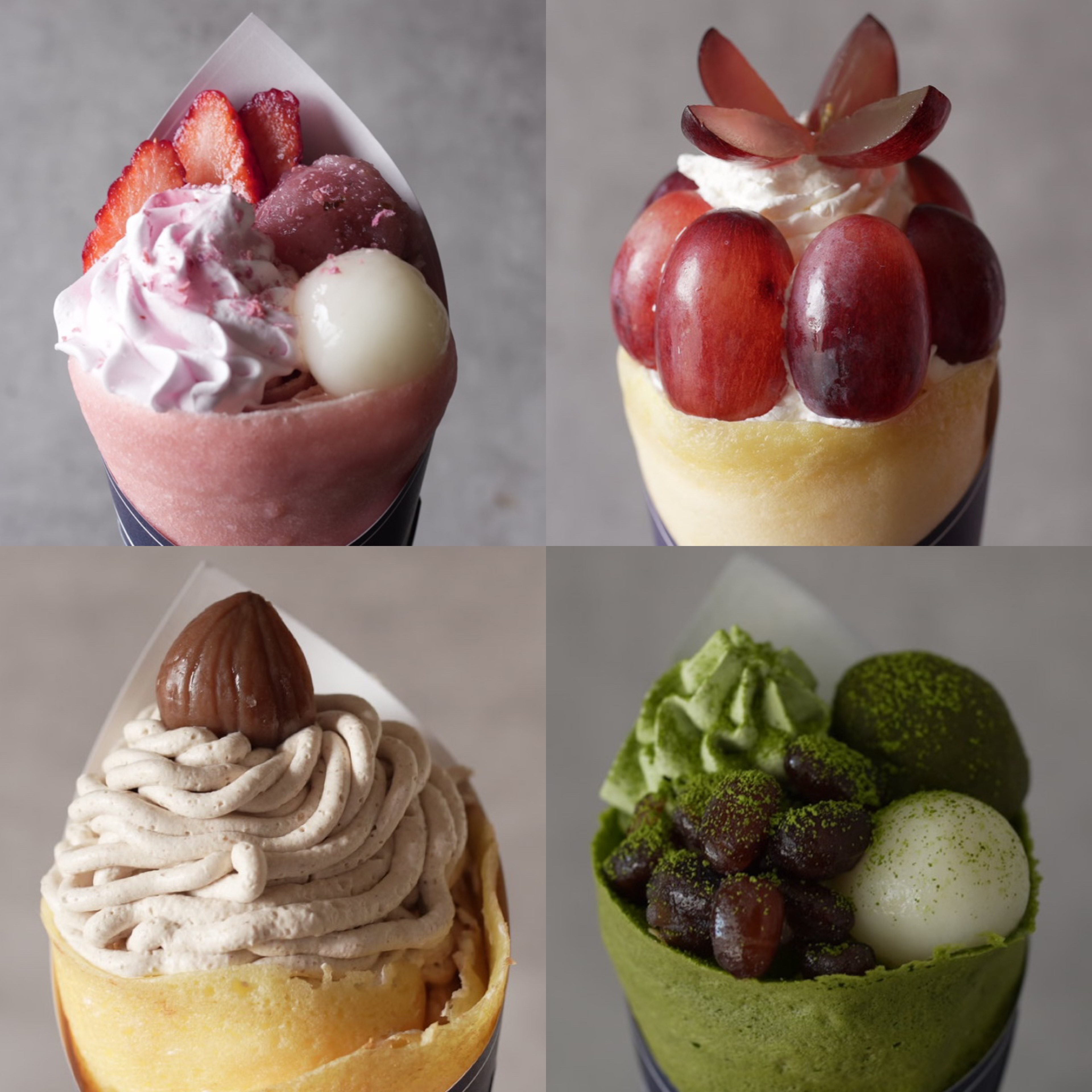 JOIE CREPEのクレープは季節を意識した季節限定メニューが人気です。春には桜とイチゴのクレープ、秋にはさつまいものブリュレやさつまいものシュガーバター、モンブランクレープなど、季節のクレープが楽しめます。