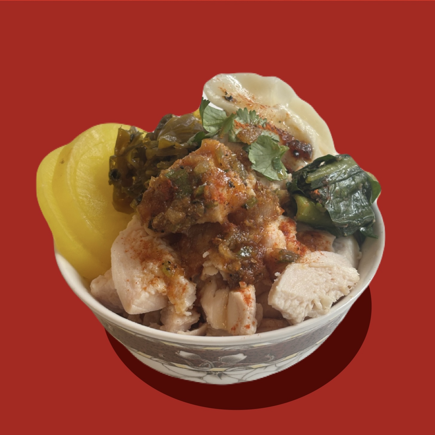 自家製の薬膳辣油をたっぷりとかけた一品。