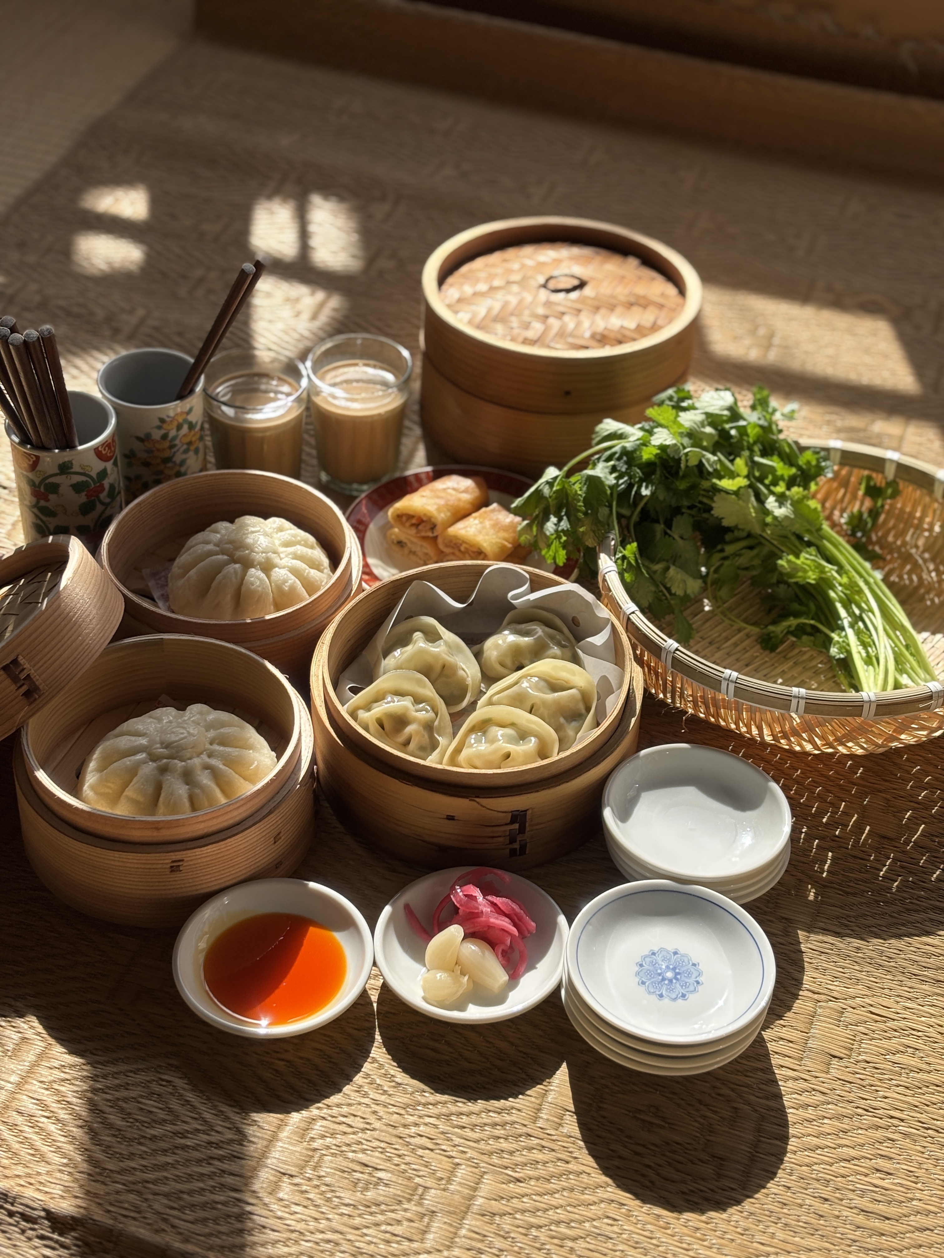 自家製辣油と蒸し餃子。