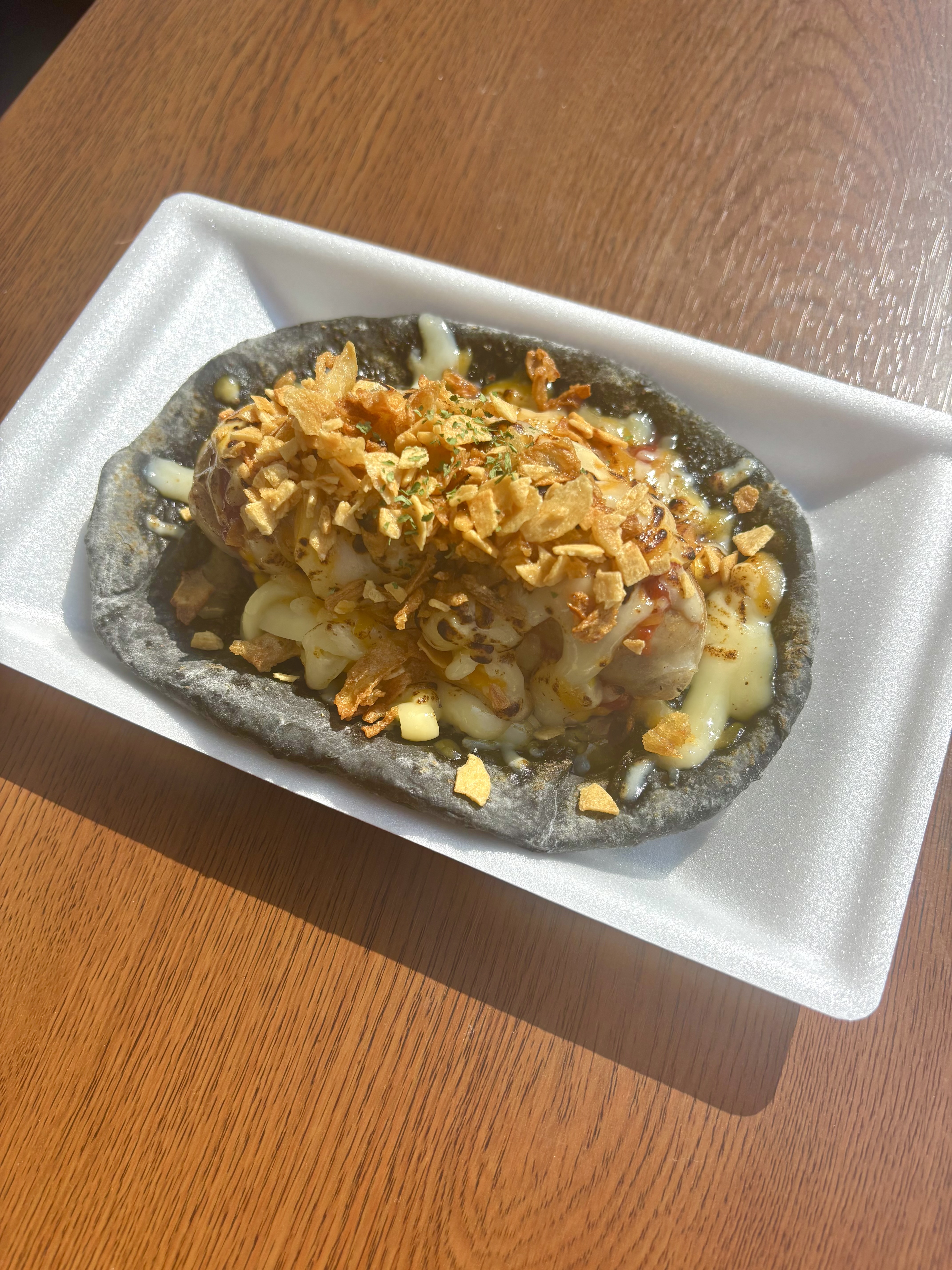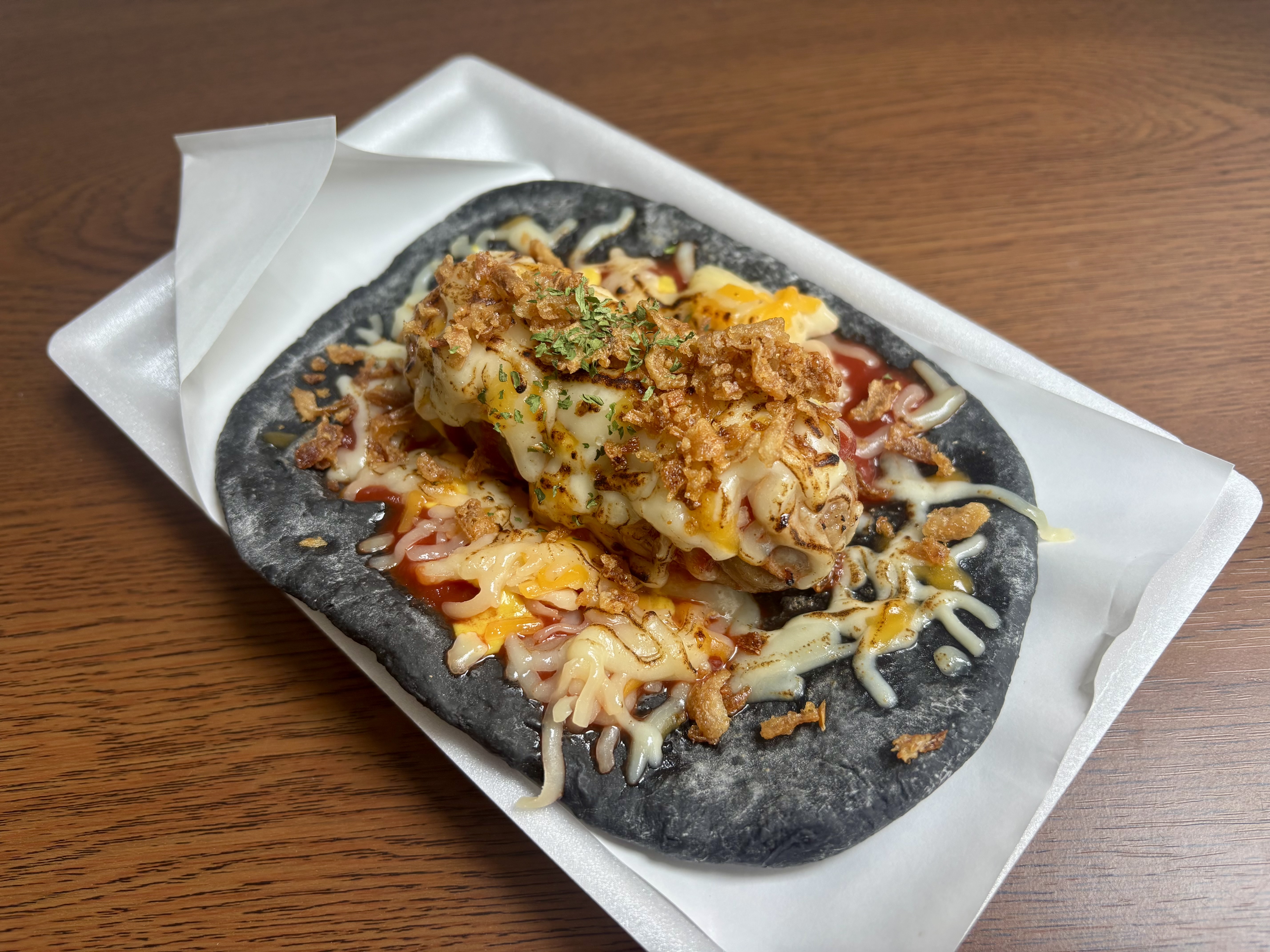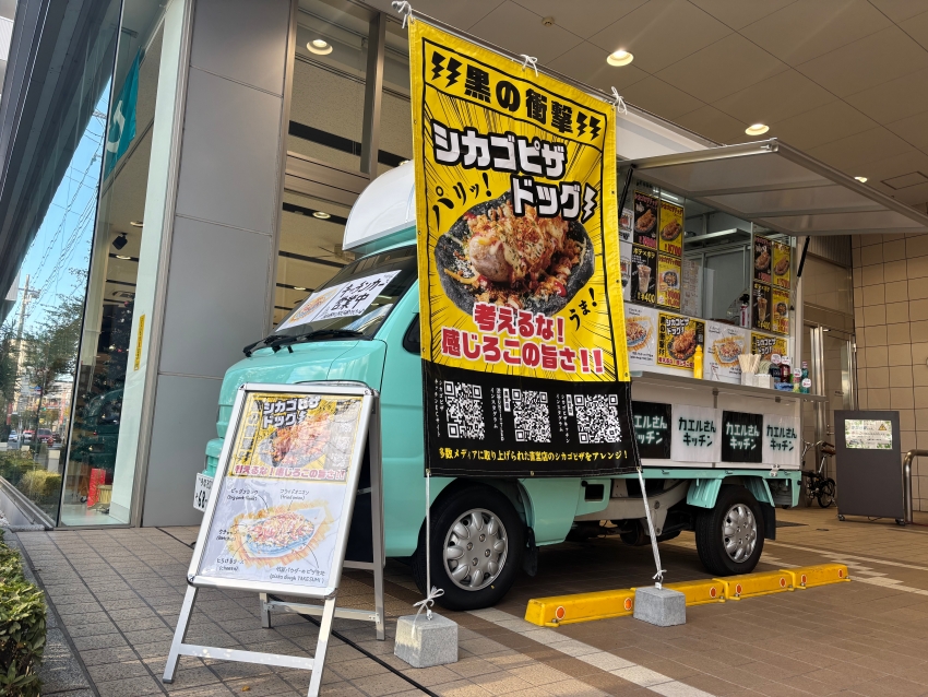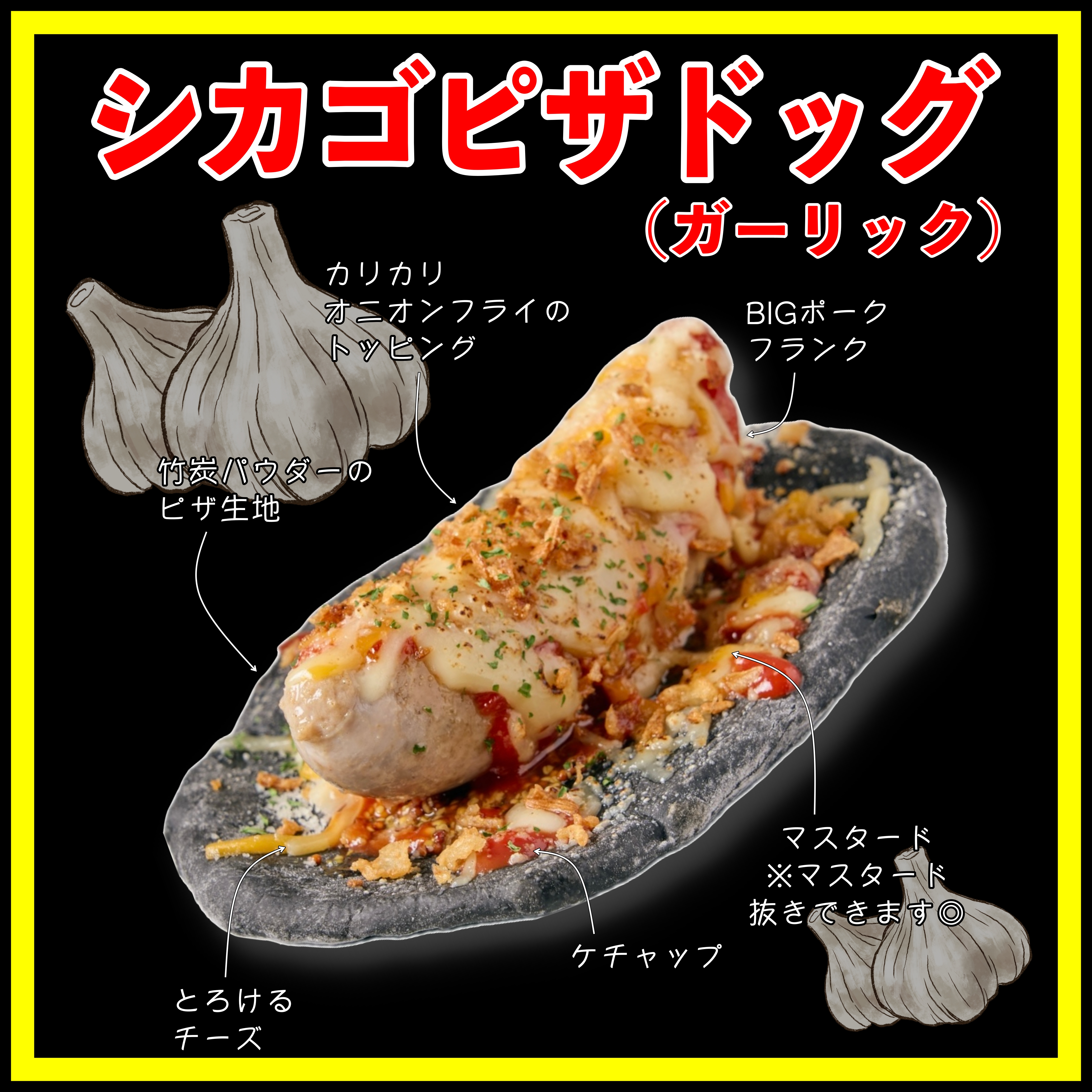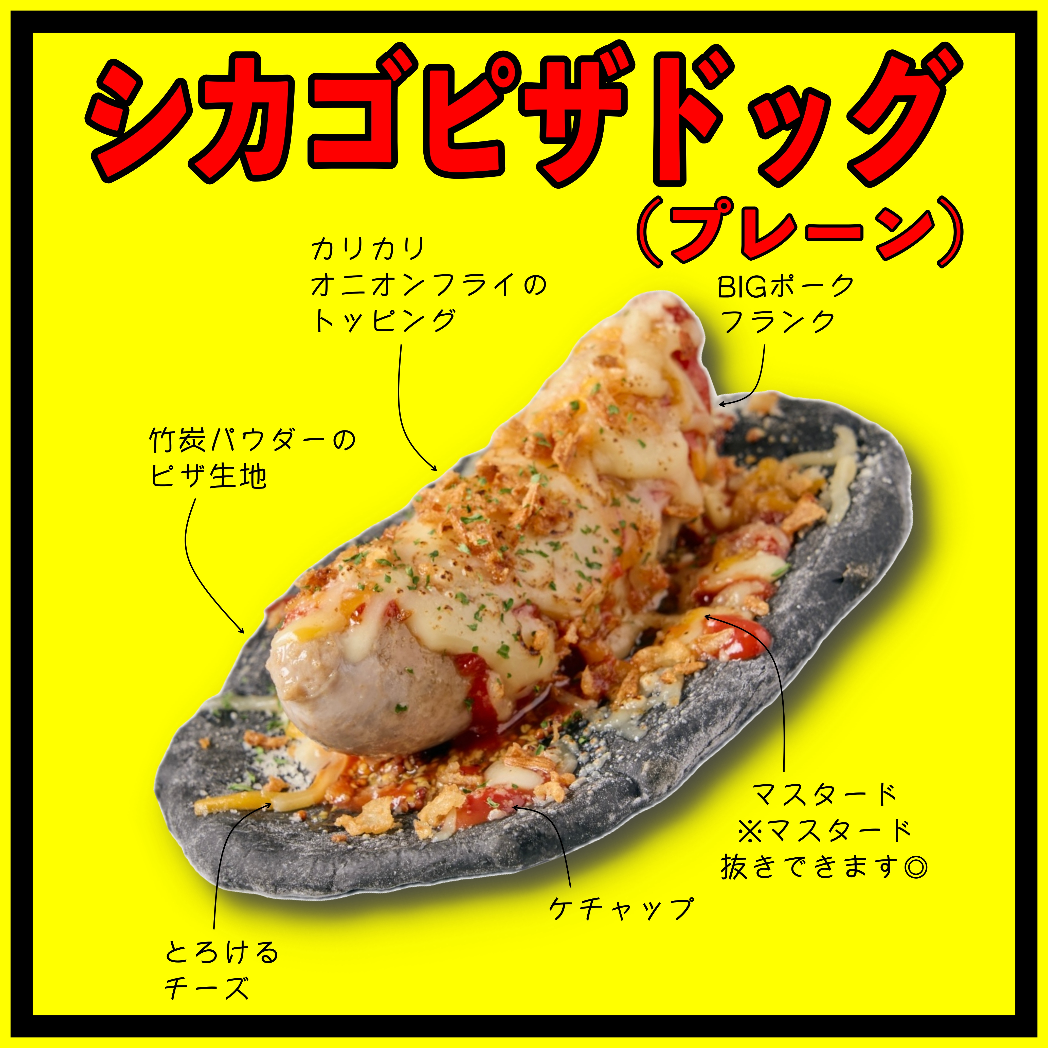 看板メニューの【シカゴピザドッグ】は直営店のシェフ監修”唯一無二”竹炭パウダーを練り込んだ黒いピザ生地×極太フランクがインパクト大!食べ応えも抜群です♪ここでしか食べることができない逸品となります。見かけた際には是非ともご賞味ください。