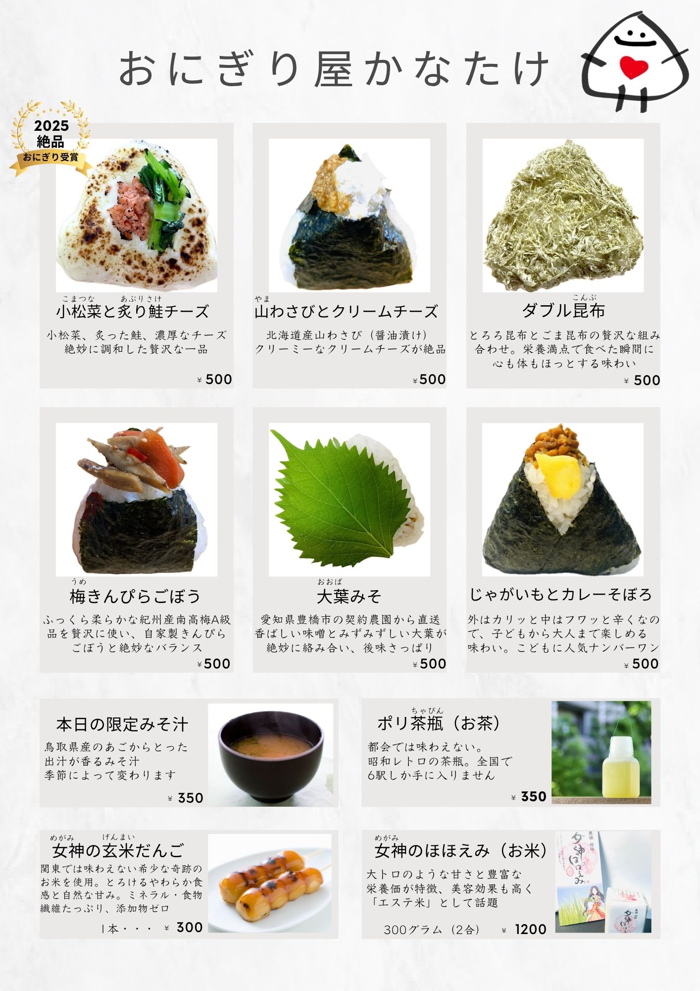 お米ソムリエ・白米ソムリエ・野菜ソムリエの資格を持ち、素材の旨みを最大限に引き出す“プロの握り”にこだわっています。奇跡のお米「女神のほほえみ」を使用し、炊きたて・握りたてでお届けするおにぎりは、2025年「絶品おにぎり」コンテストで受賞。テレビ番組『マツコの知らない世界』でも紹介され、多くの反響をいただきました。