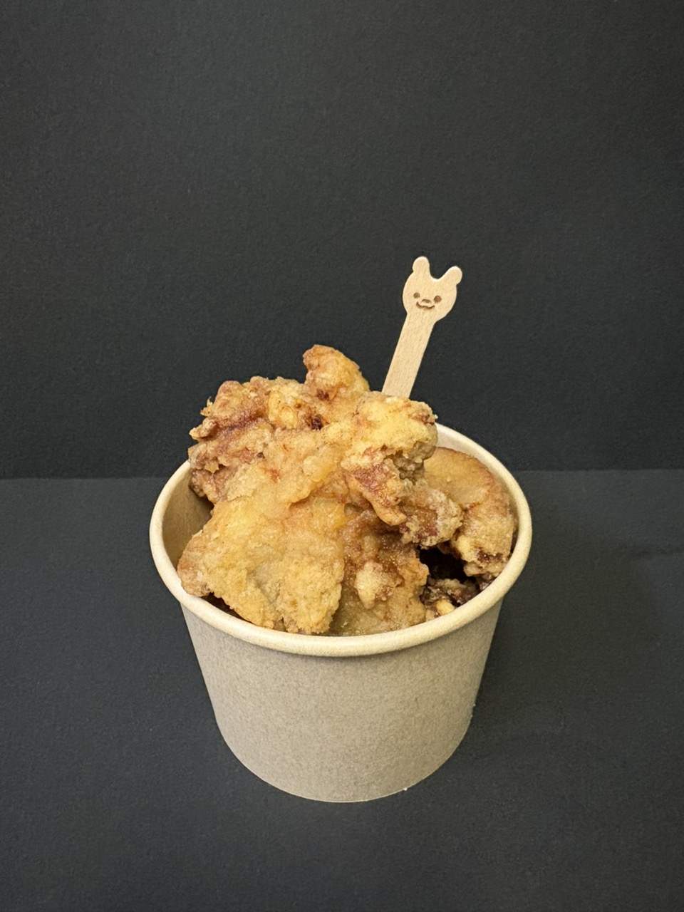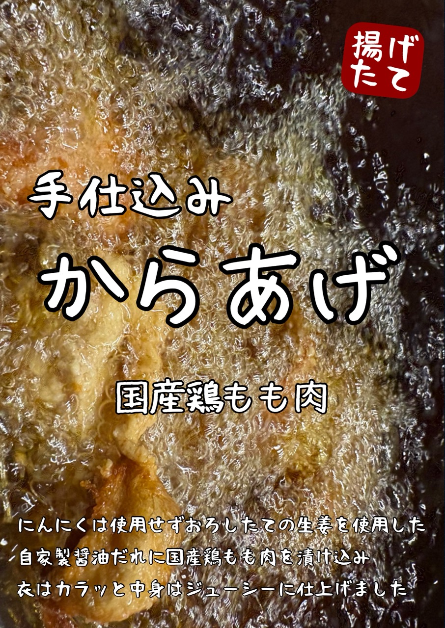 にんにくは使用せずおろしたての生姜を使用した自家製醤油だれに国産鶏もも肉を漬け込み衣はカラッと中身はジューシーに仕上げました