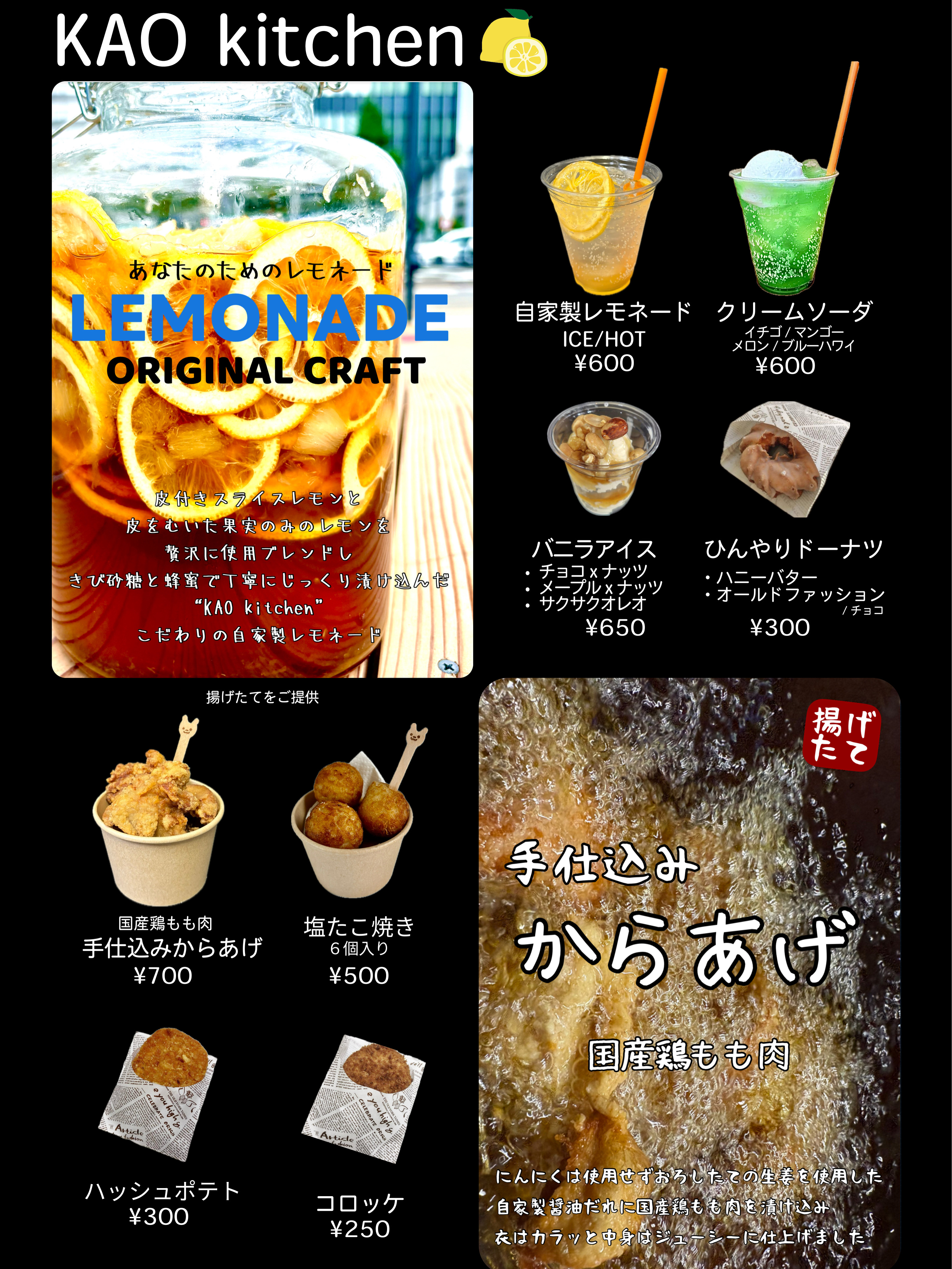 自家製レモネード、手仕込み唐揚げ、唐揚げ弁当、塩たこ焼き、コロッケ、ハッシュドポテト、クリームソーダ、ドーナツ、バニラアイス