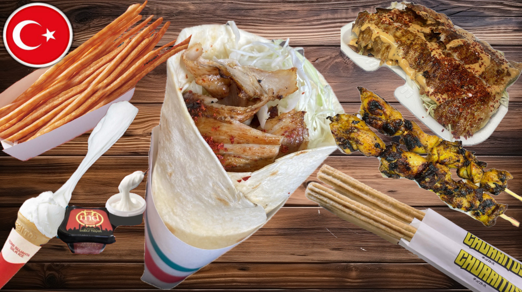 ケバブサンド、シシケバブ、カップケバブ、トルコアイス、ロングポテト、ロングチュロス、レモネード、トルコスープ