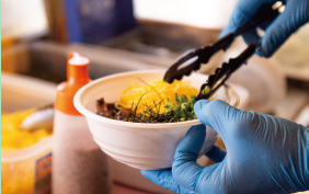 写真を見て驚いた方も多いかもしれません。実は鶏飯と一緒にレインボーサンドも提供しているけいはんさん。これは、もっと若い人たちにも鶏飯を知ってもらおう、好きになってもらおうというアイディアから。他にもイチゴとマシュマロのふわふわ串や、レインボーサーターアンダギーなど、学生が飛びつくようなワクワクメニューが盛り沢山です。