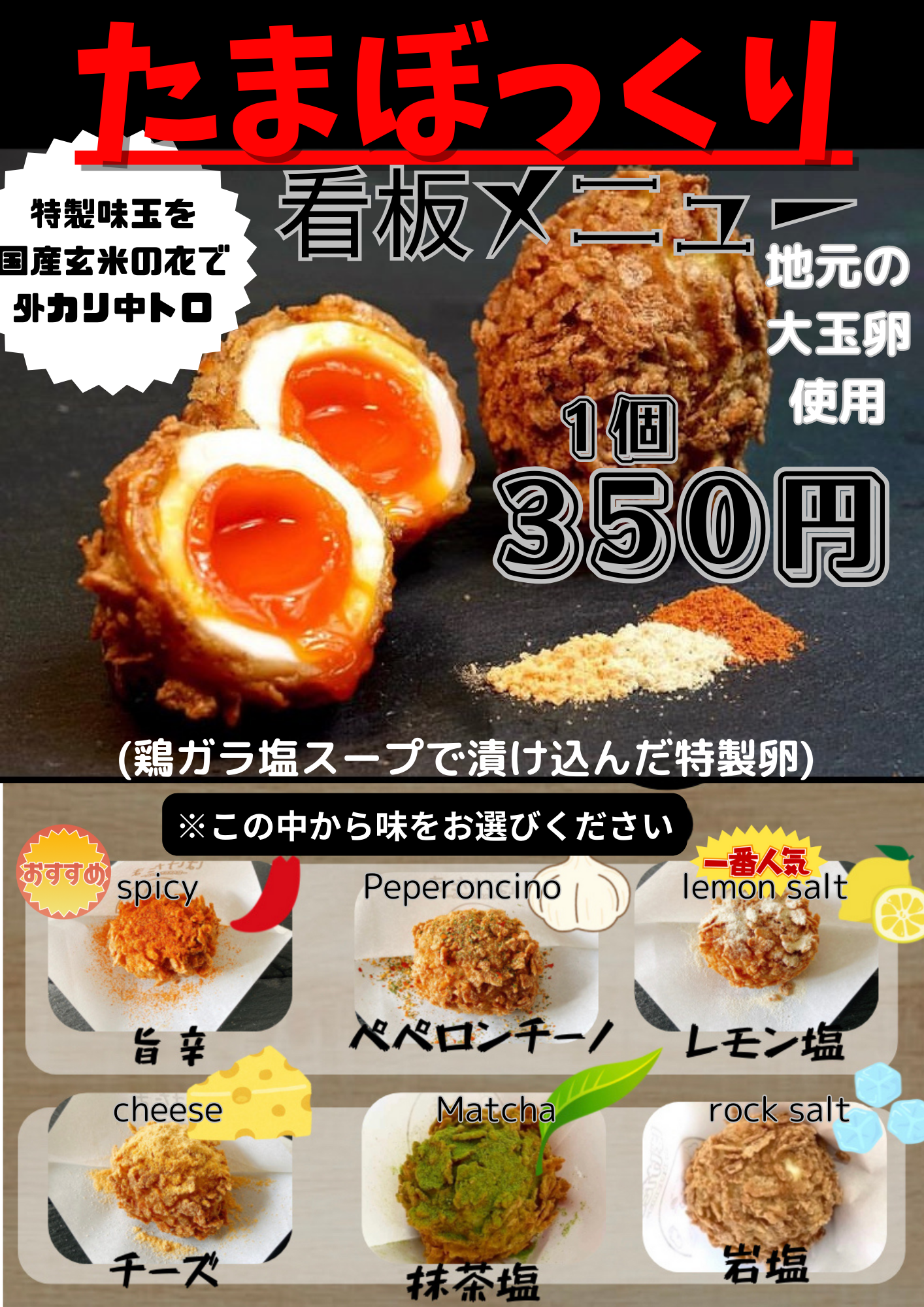 世界で当店だけ!群馬の特注L玉を超半熟に鶏がらスープに24時間漬け込みゆで味玉に、卵バッター、国産玄米の衣を使用!油で揚げガリトロの食感