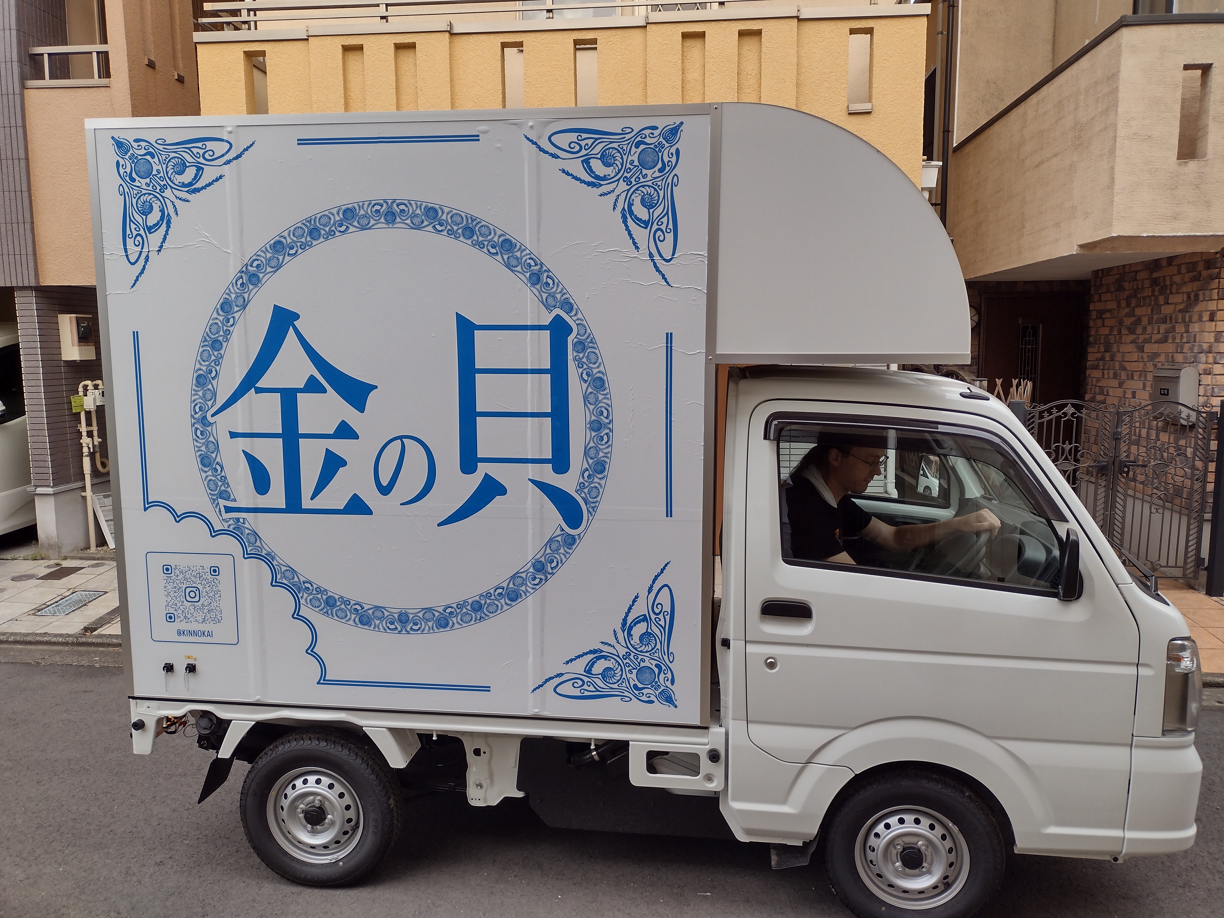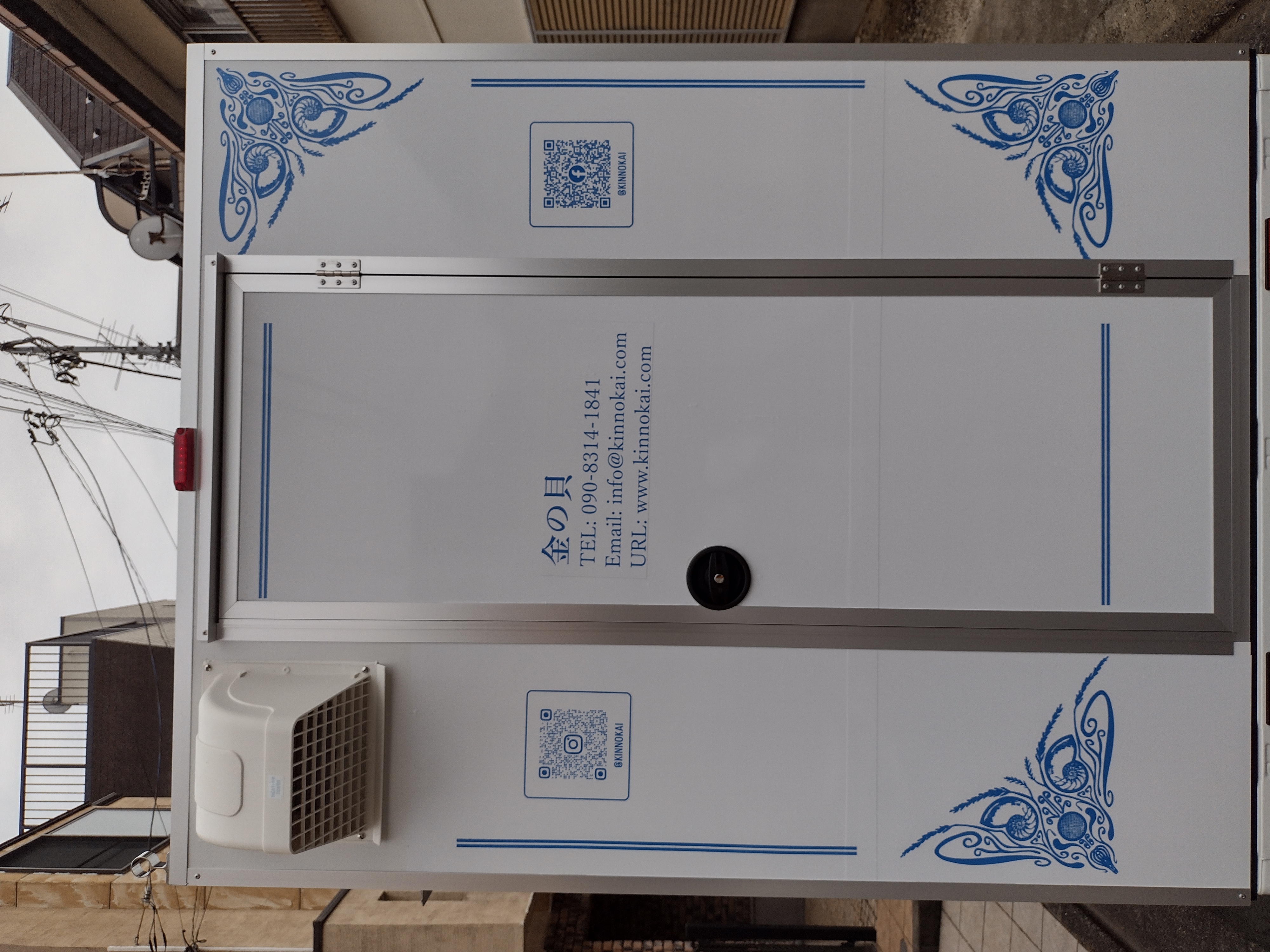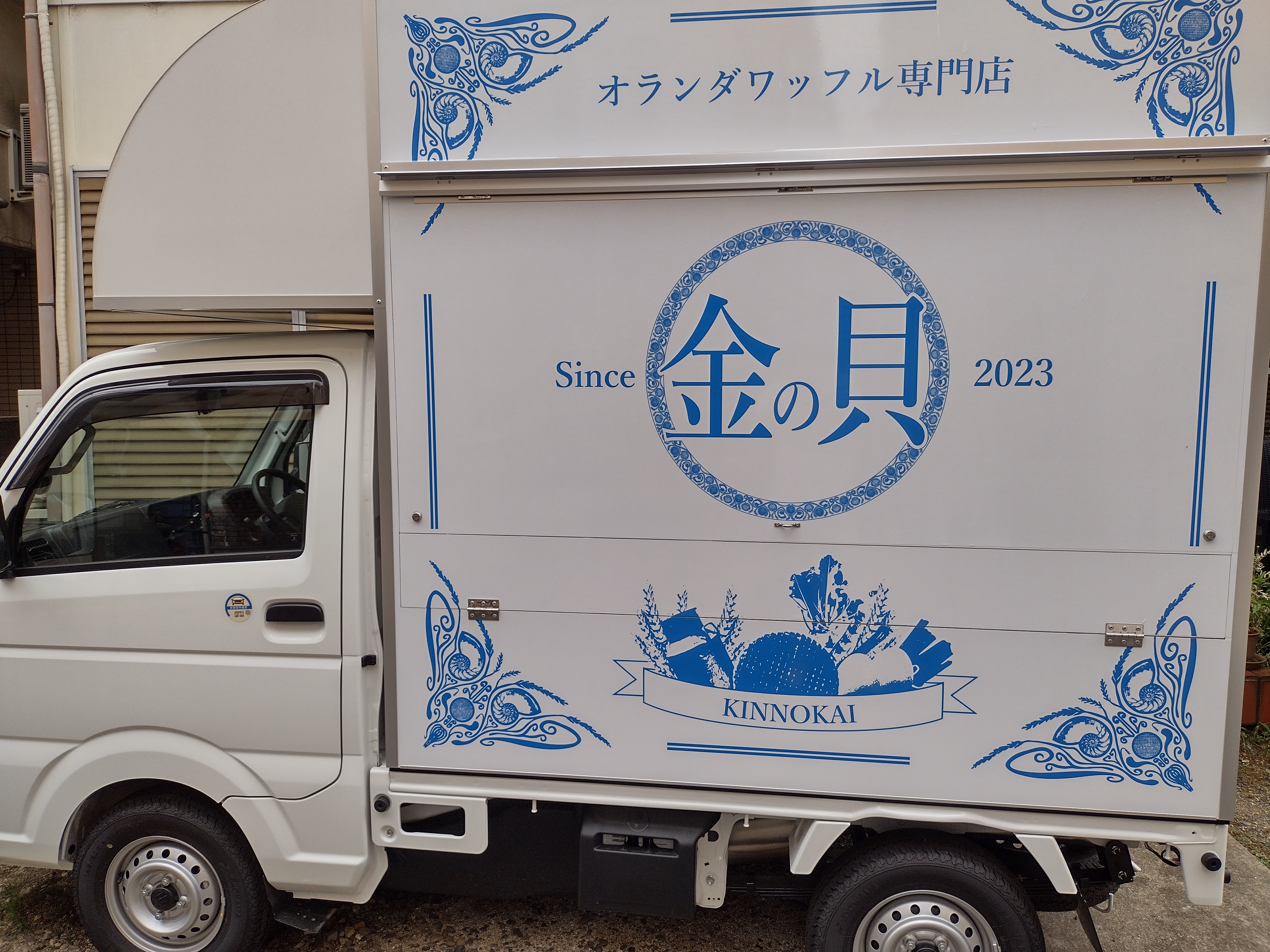 『金の貝』のキッチンカーは、オランダのデルフト陶器をイメージした外観です。置き場所を選ばないシックさと、お洒落で可愛い白と青のデザインです。