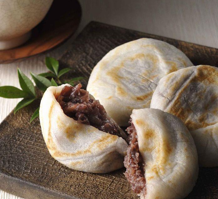 もち米粉に粒あんを挟んで焼いた焼き餅になります。