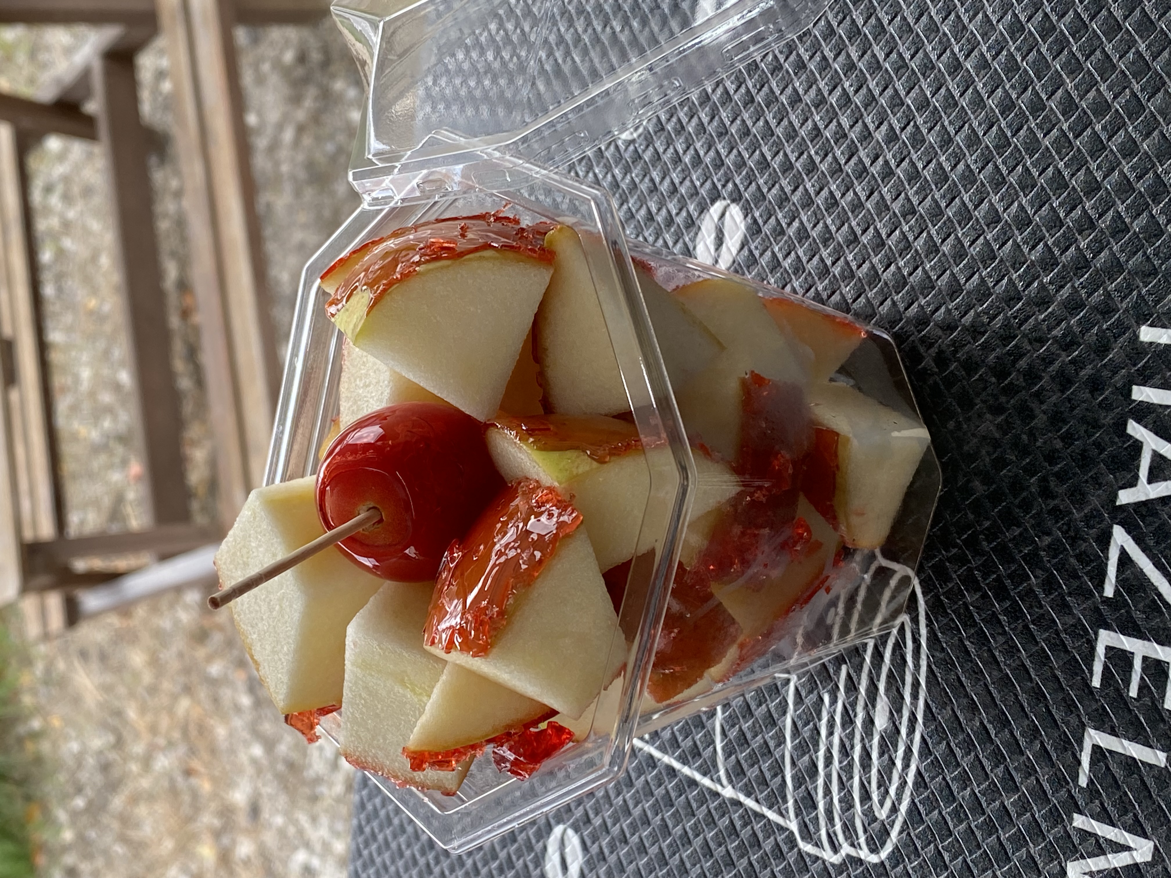 青森の農園より直送しているりんごを使用したりんご飴、丸ごとコンポート、コンポートゼリーなど開催内容や対象、天候など考慮して販売しています。