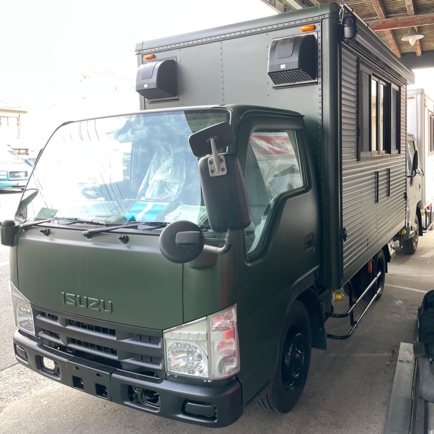 マットカーキの地味で重厚感の、ある外観。開店前は軍用車をイメージするかもしれません。