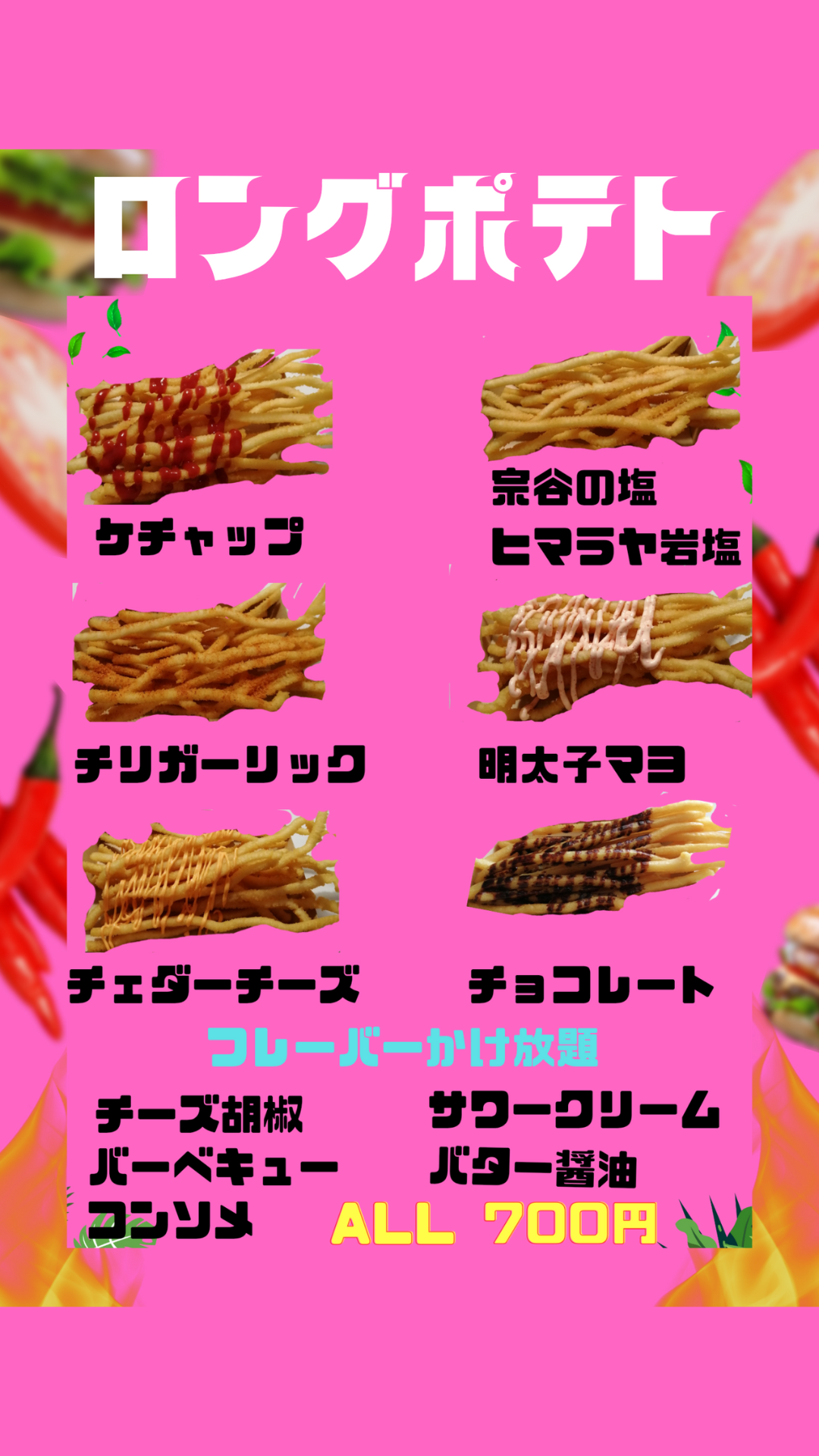 ロングポテト 唐揚げ ハンバーガー ドリンク各種