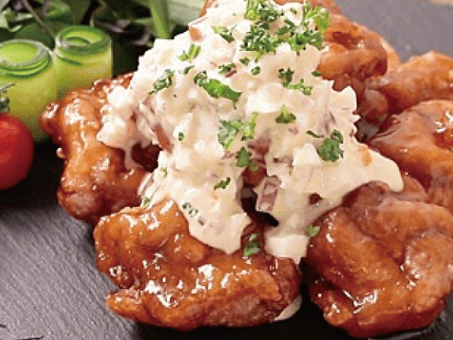 にんにくと醤油で下味をしっかりつけた鶏のもも唐揚げを2度揚げでカラッと仕上げてます。