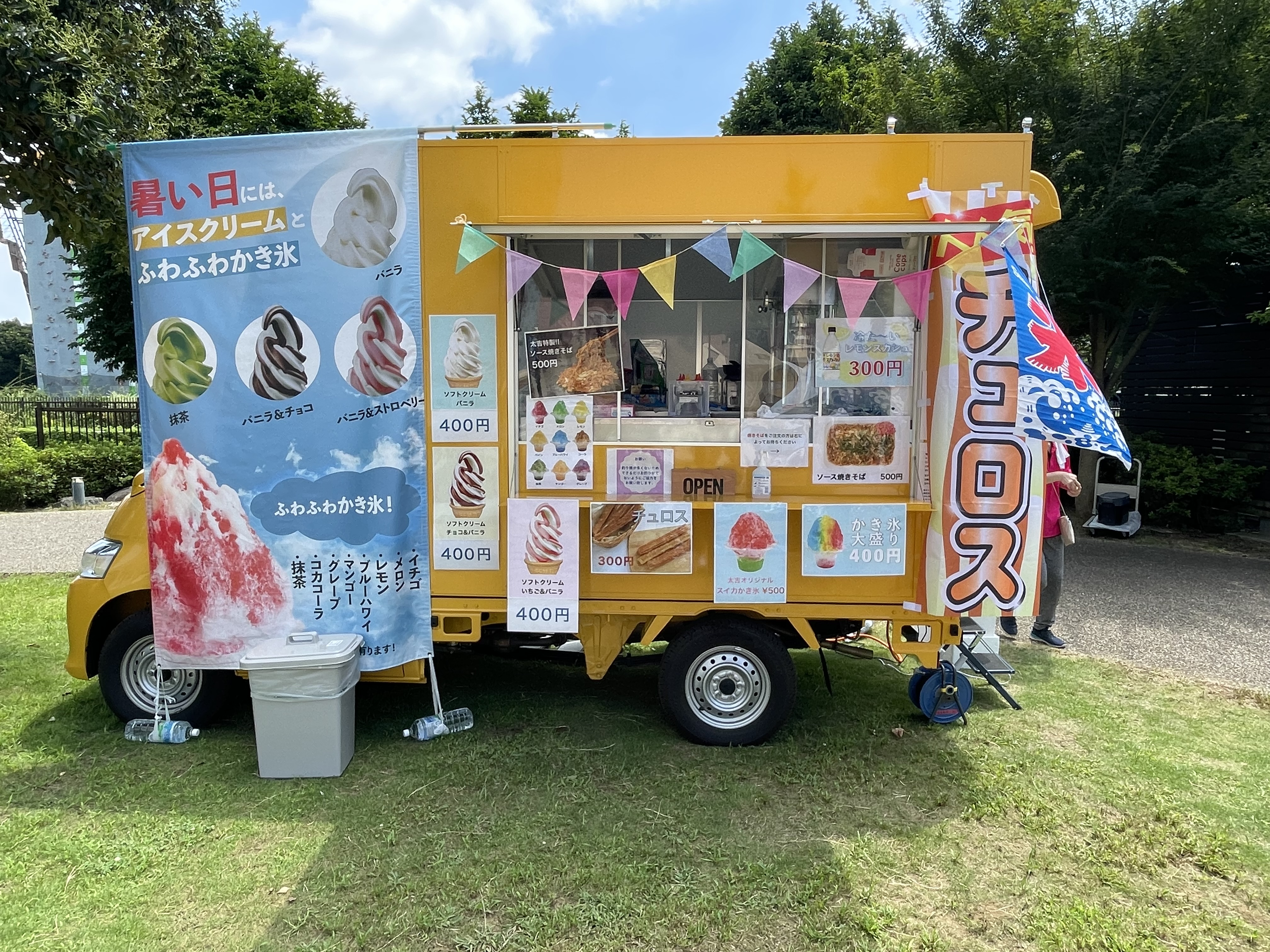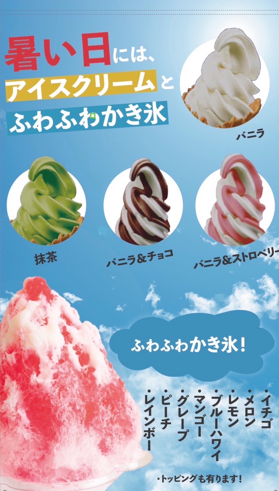 焼きそば、チュロス、コーヒー、ソフトクリーム、かき氷(夏季)