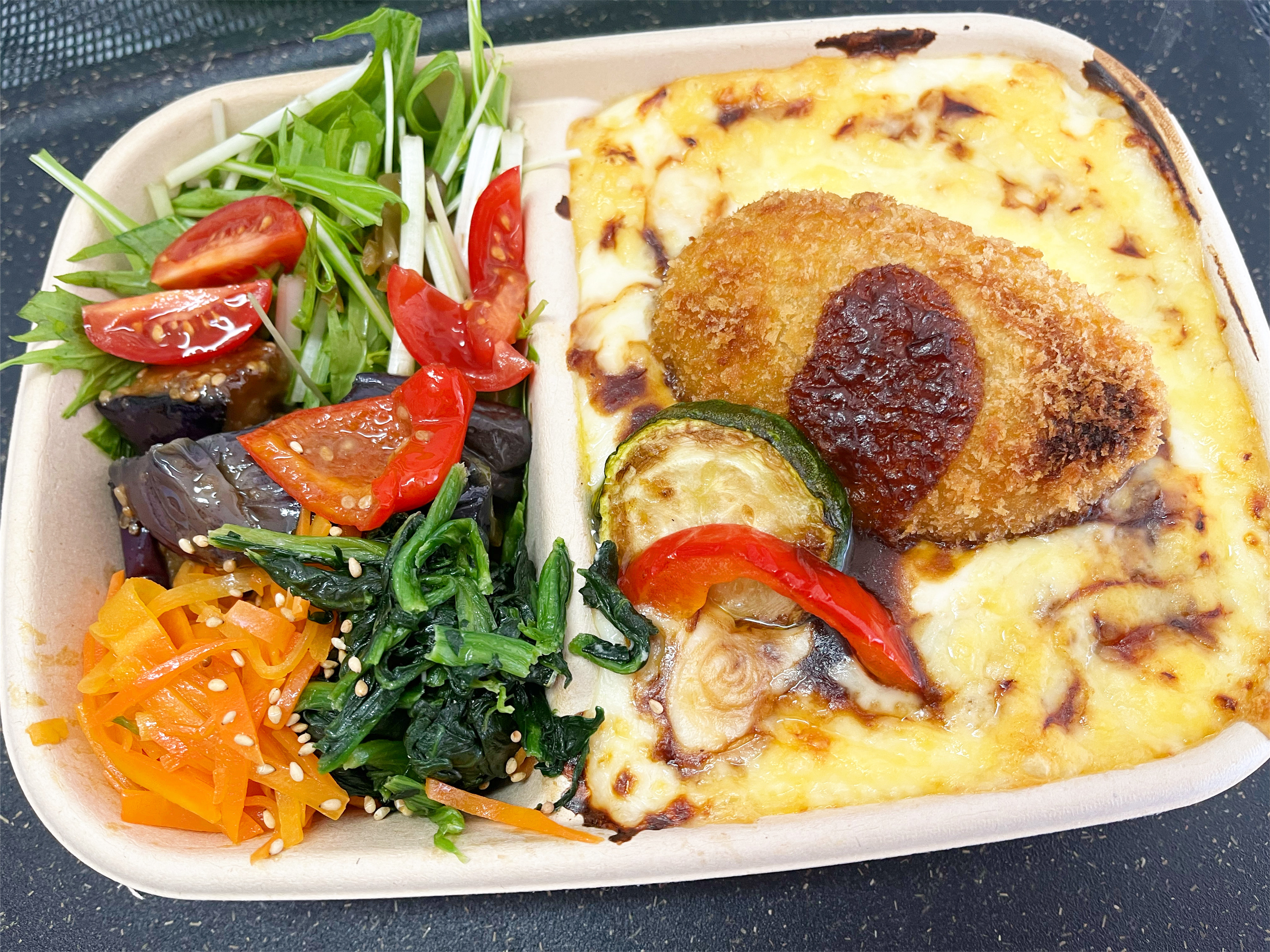 自家製ホワイトソースとコロッケがのったあつあつドリアを日替わりデリと合わせお弁当に!