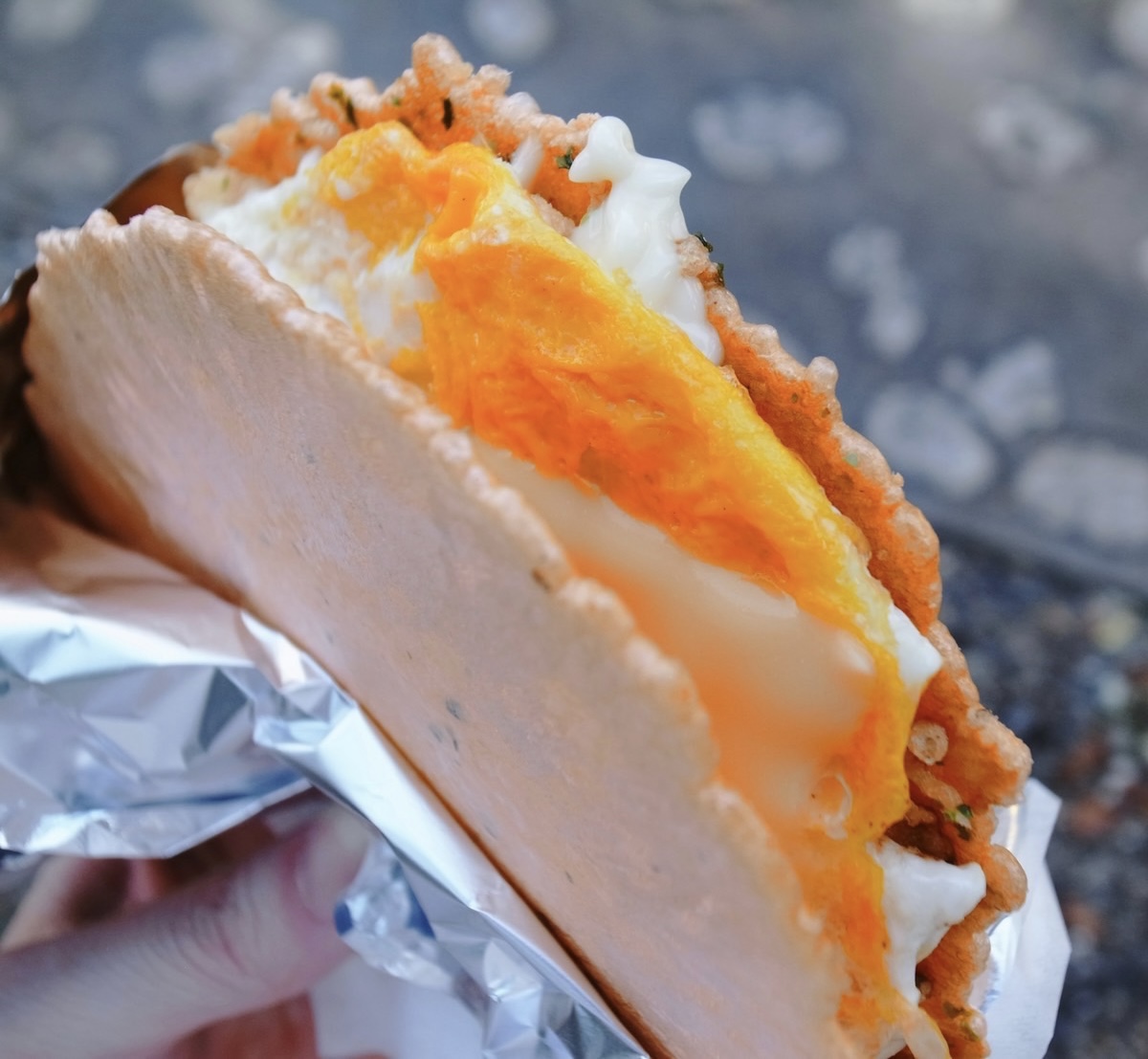 大きな海老煎餅に卵・ハム・チーズを挟みました。