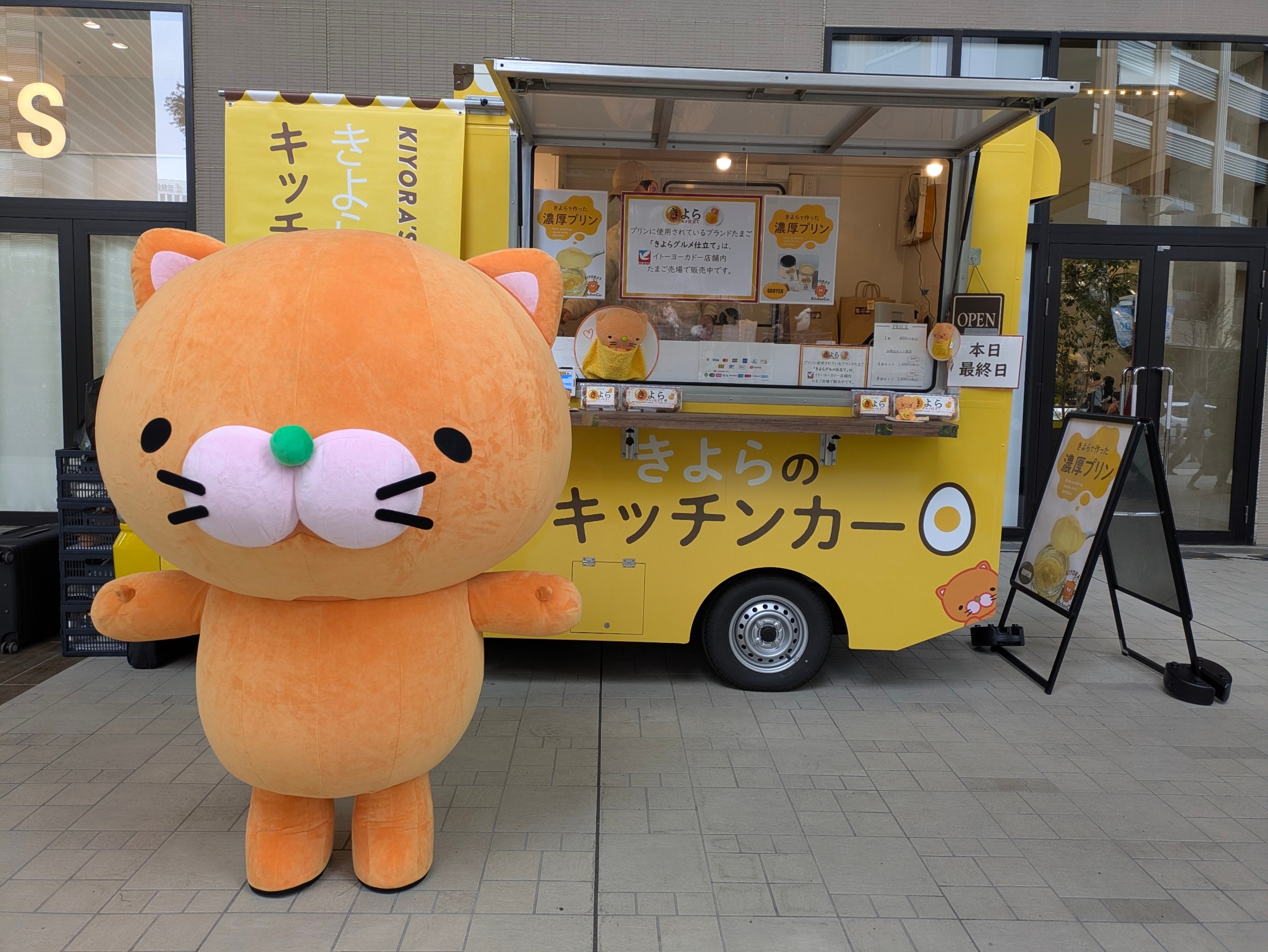 きよらスイーツキッチンカーの店長は、あの人気CMキャラクターの寝冷えネコ「きよニャ」。