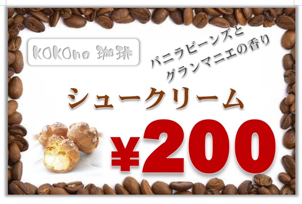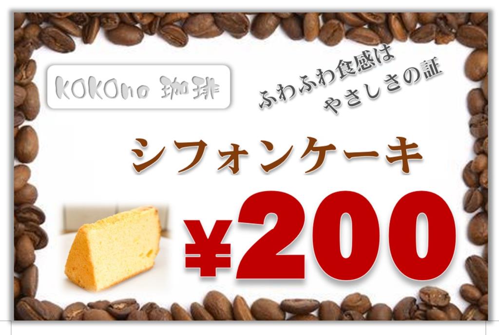コーヒー(ホット、アイスとも):350円、シフォンケーキ、シュークリーム、ショコラケーキ:200円
