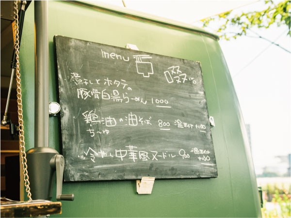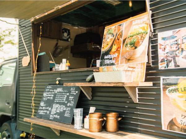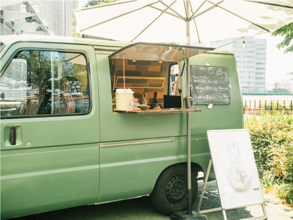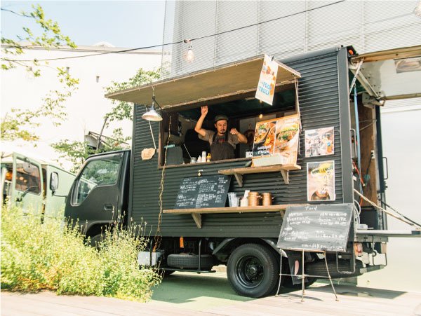 栗原商店は、いすずのエルフと、トヨタのデリボーイという異なるキッチンカーを2台所有しています。両方とも外観は落ち着いた色味で、どんな会場にも馴染みやすいクールな印象。飾り付けなども、車の雰囲気を壊すことないおしゃれさにこだわっています。