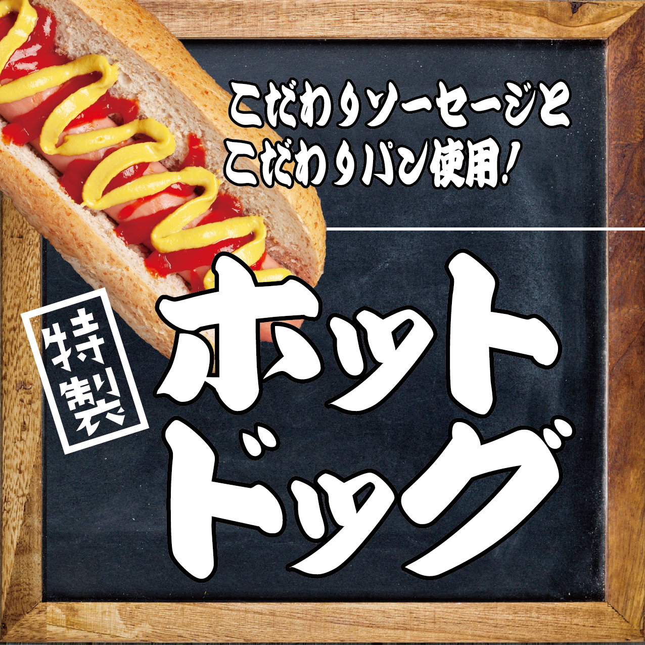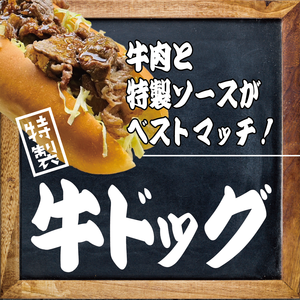 国産牛串、ホットドッグ、アルコール、ドリンク