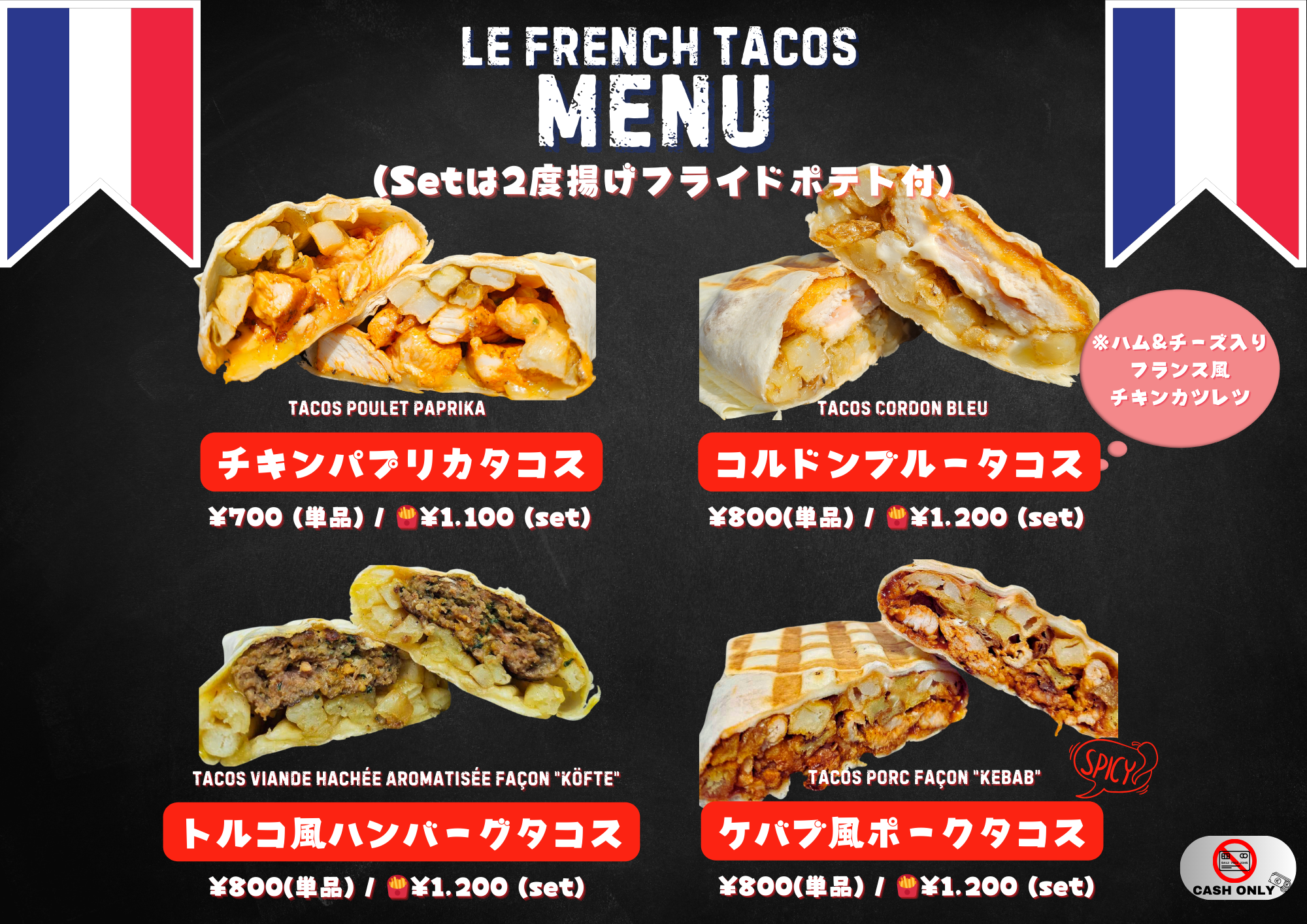 フレンチタコスはトルティーヤ生地にお好みのお肉、ソース、チーズソースとフライドポテトを詰めてグリルで焼き上げたフランスで大人気のファストフードです!