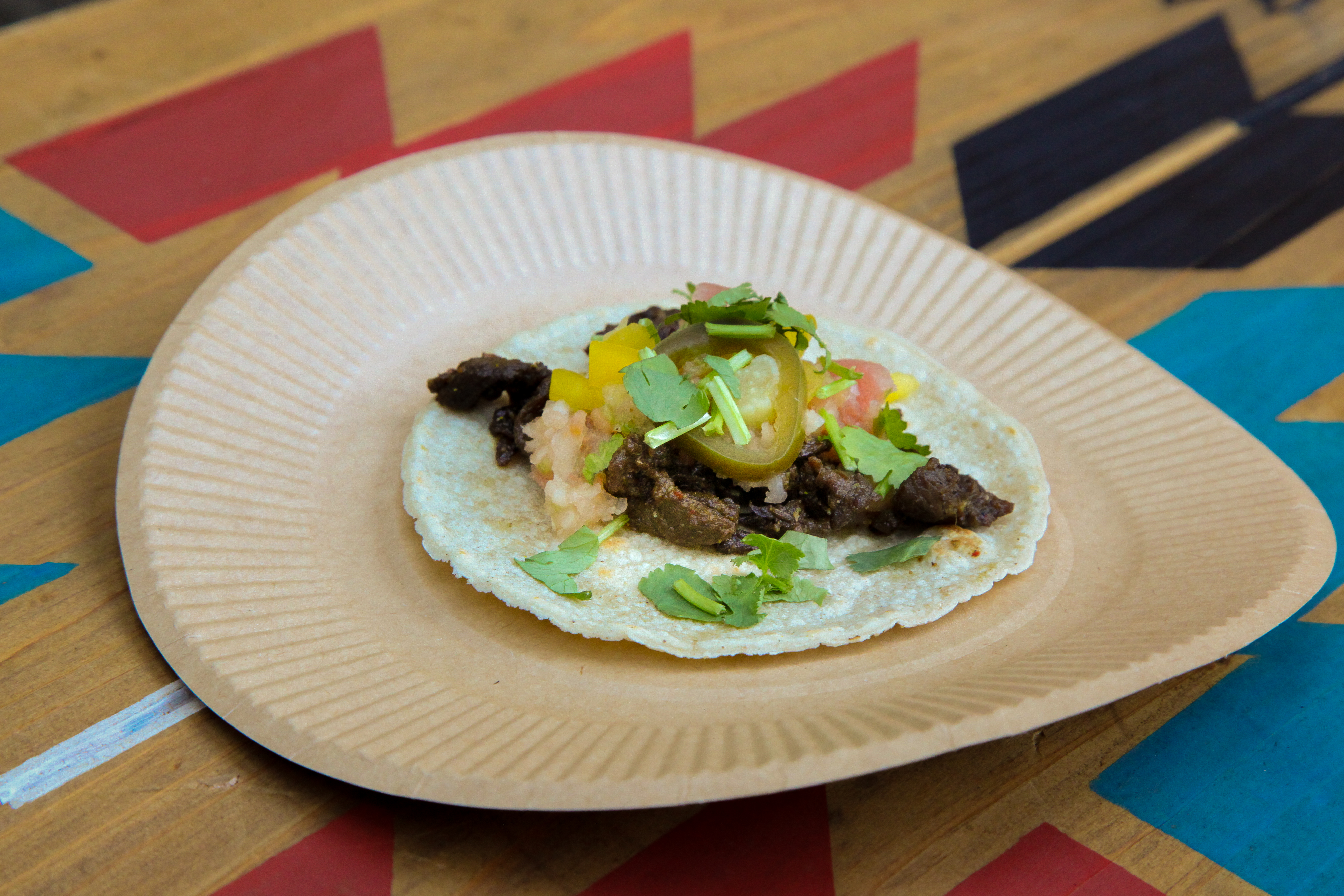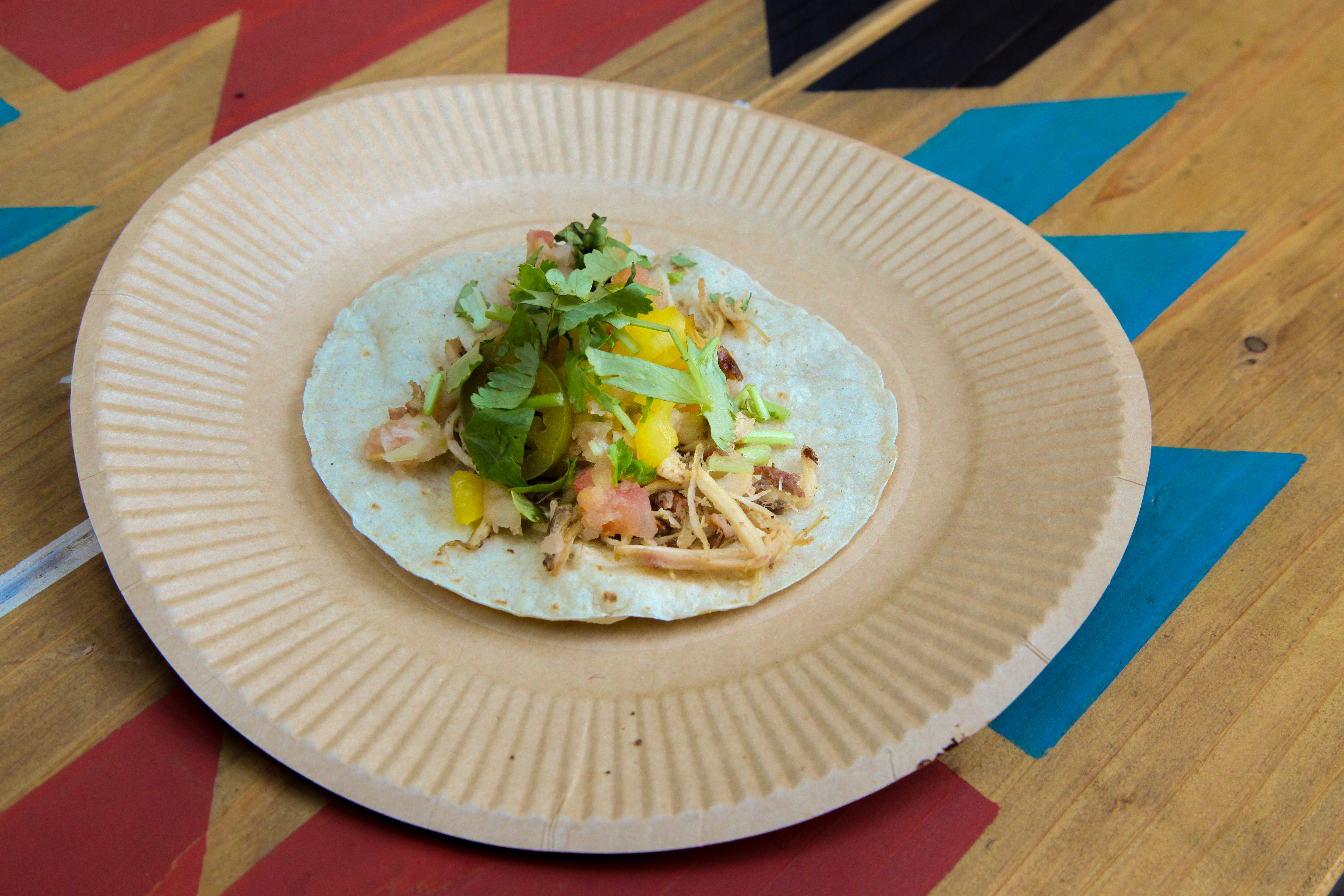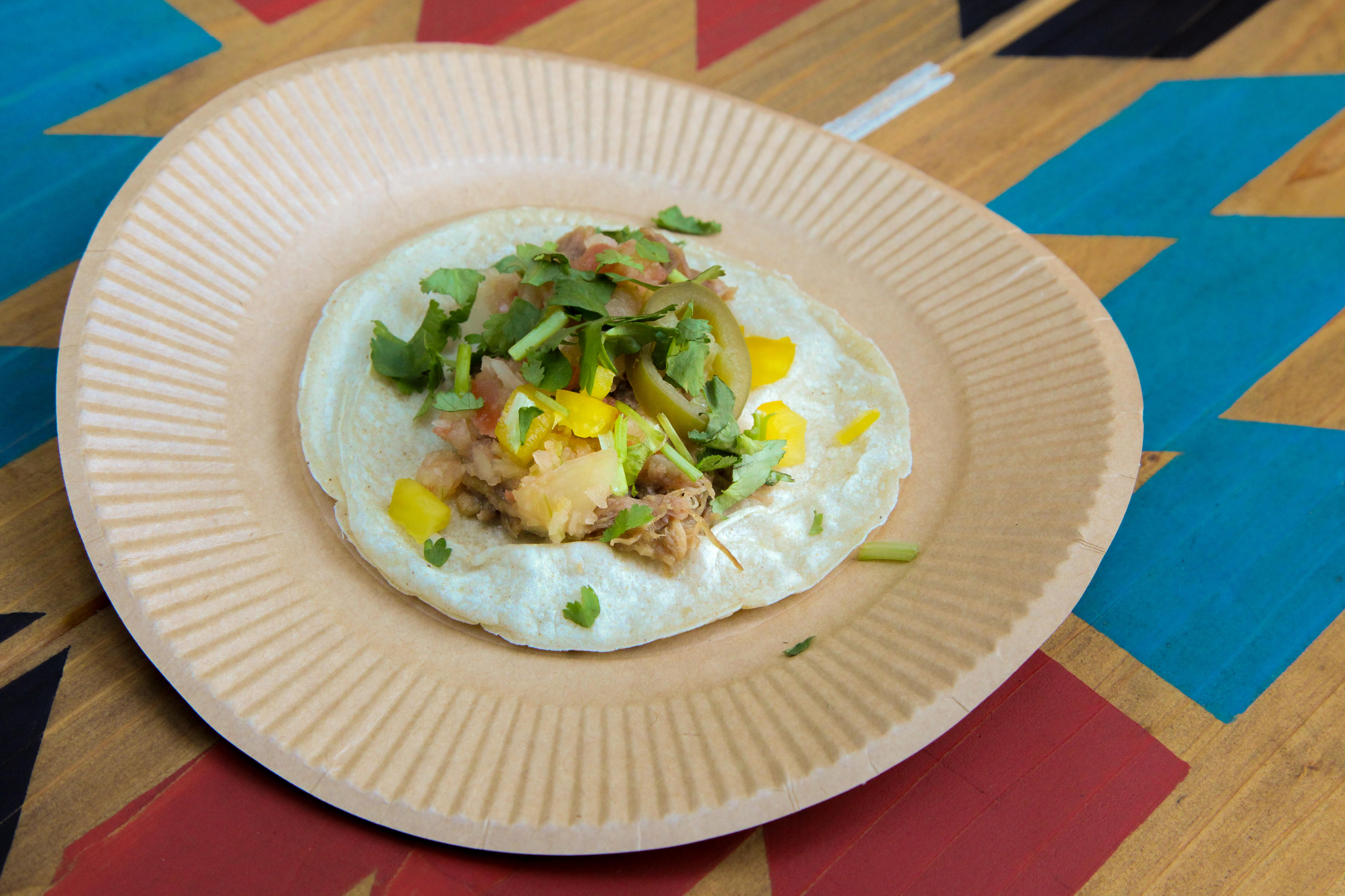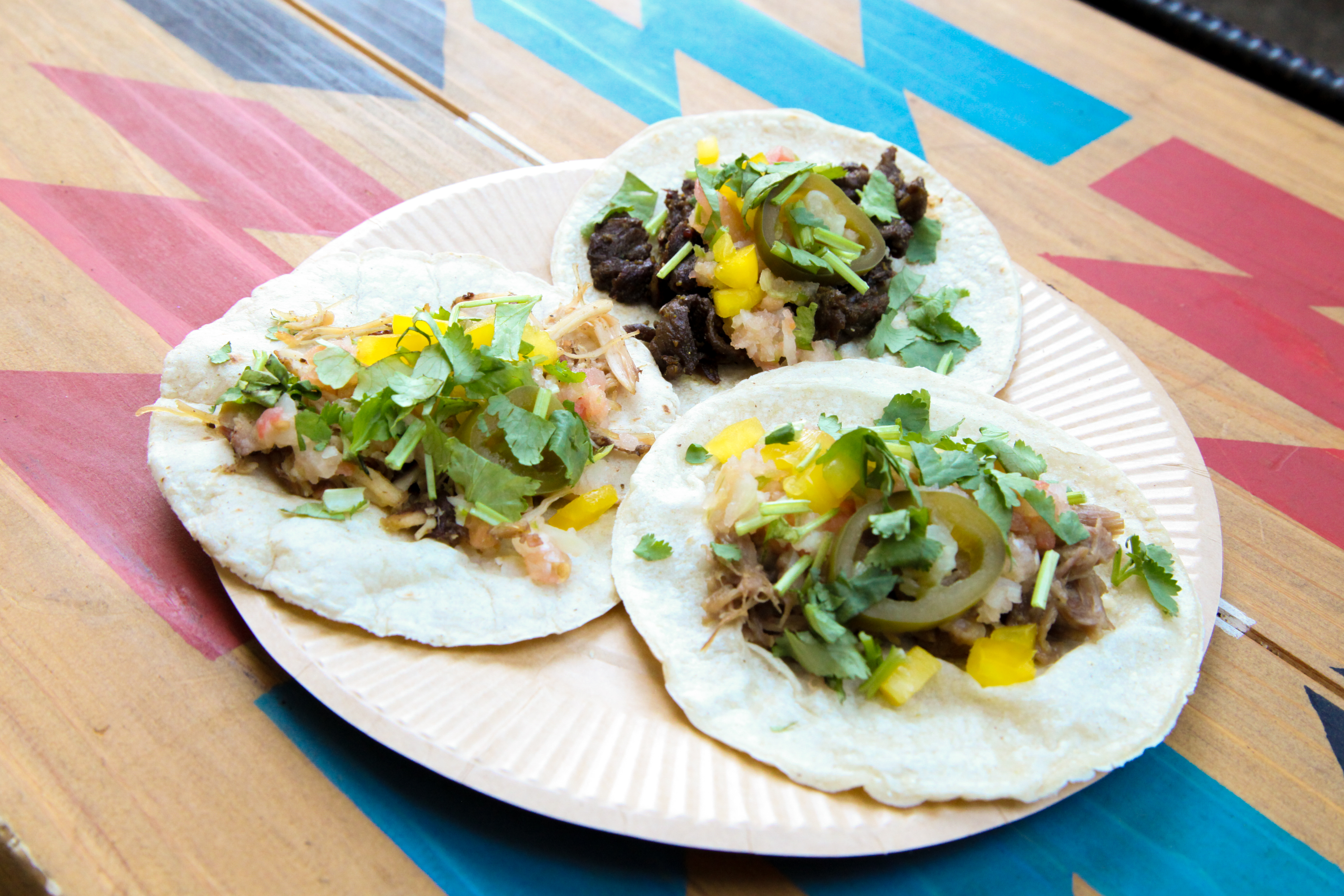 タコス5種(ジャークチキン、牛タン、カルニタス、カレーハラミ、スパイシーミンチ) フルーツドリンク