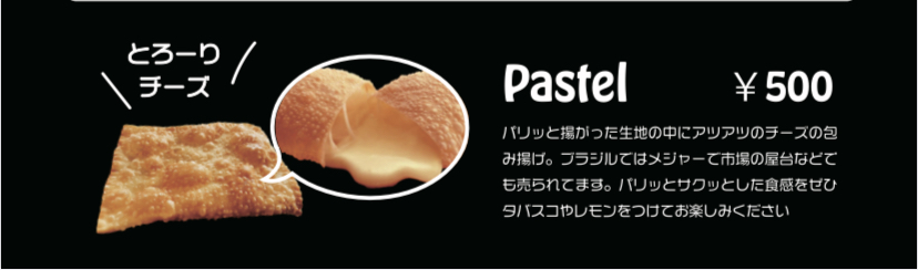 パステウ、苺削り、パステル、ポテト、わたあめ、ビール、ソフトドリンク、揚げバームクーヘン、チュロス、カキ氷