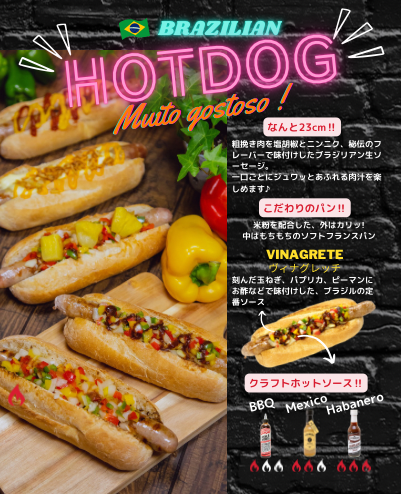 2 3cmもある、こだわりのブラジリアンソーセージをソフトフランスパンに挟んで焼き上げた、ジューシーなホットドッグ