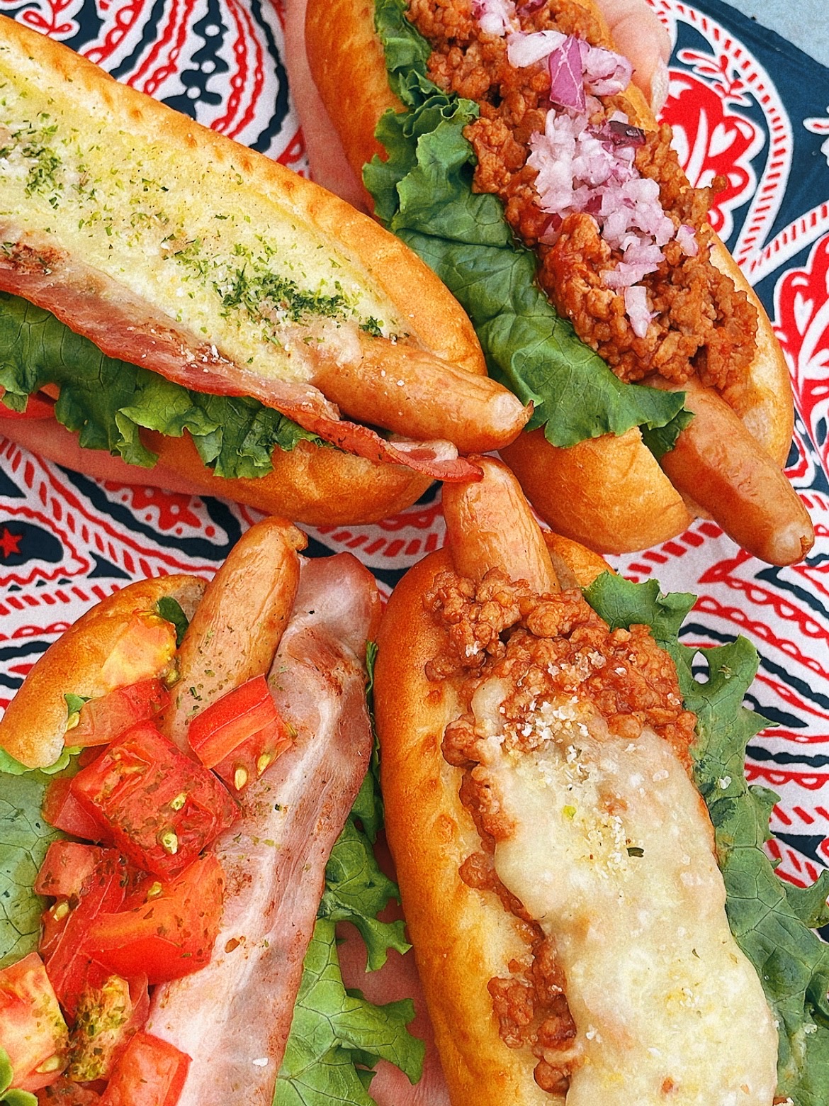 ふわふわパンにパリッとソーセージ、何も載せなくても美味しいホットドッグを目指しているので注文が入ってから一つずつ焼き始めます。1番人気の【チーズミートドック】は時間をかけ煮込んだタコミートにチーズを乗せ目の前でバーナーで炙ります。見て楽しい食べて美味しい一品です。(画像1番手前)