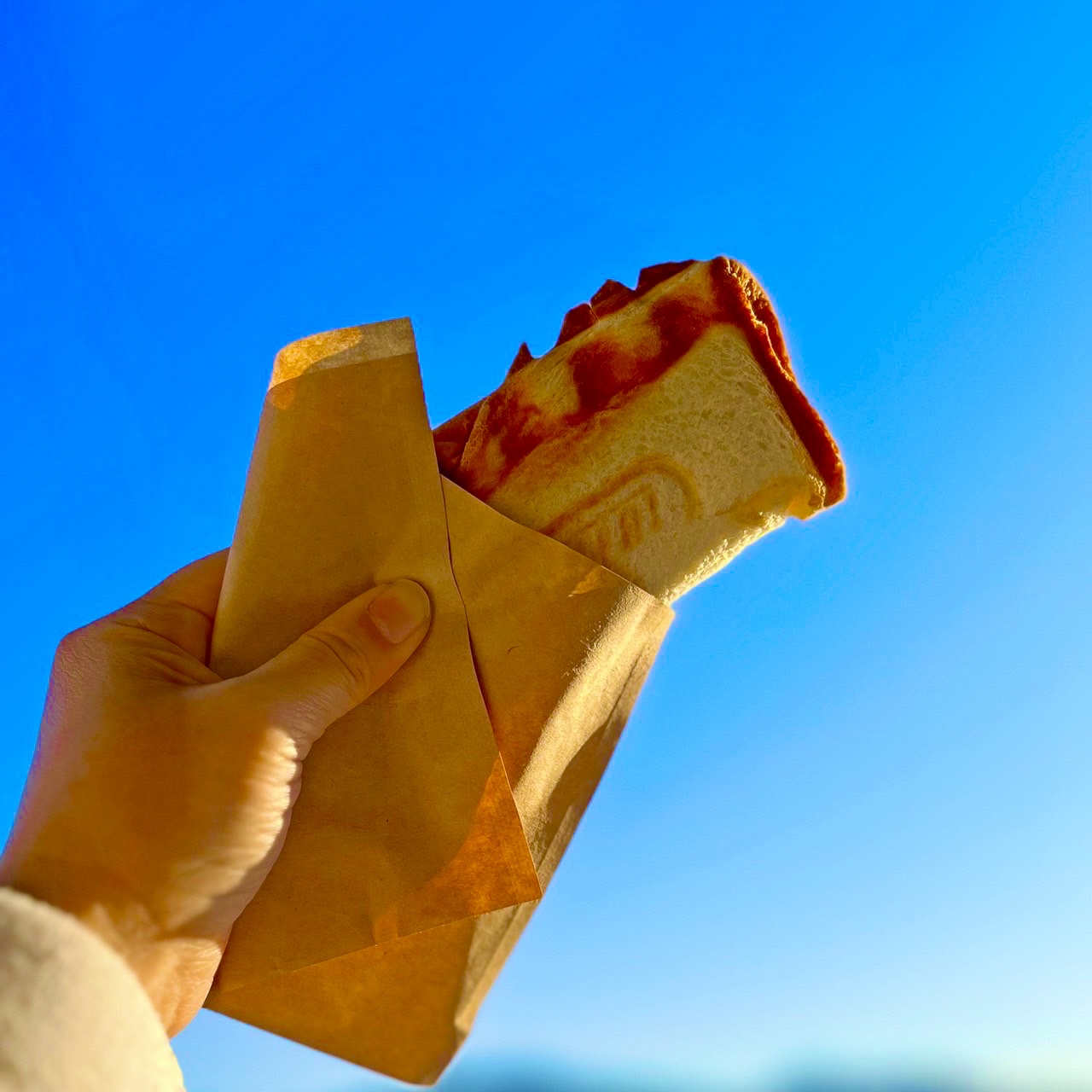 食パンで包み込んで焼き上げます。片手で手軽に食べられるサイズです。