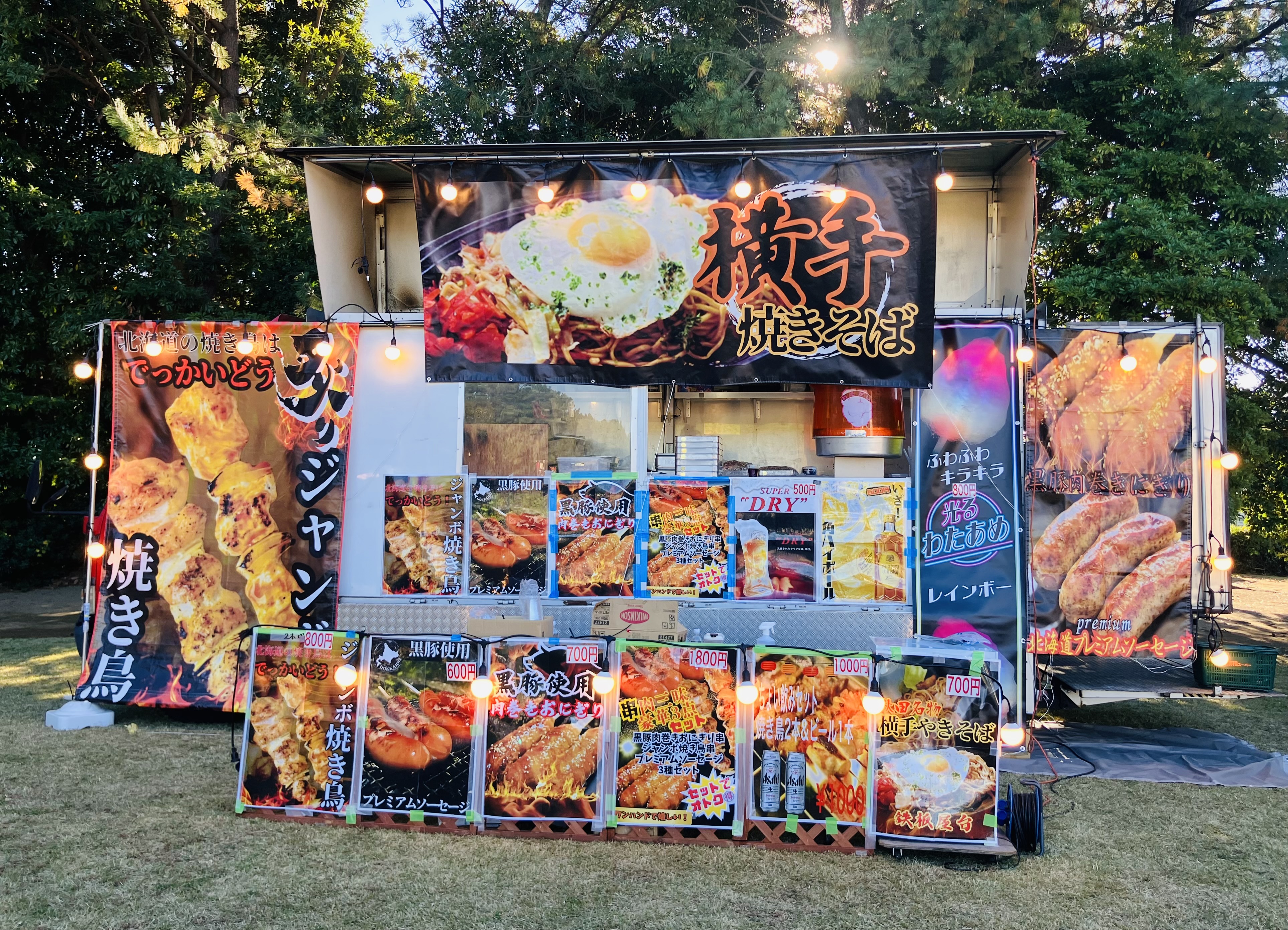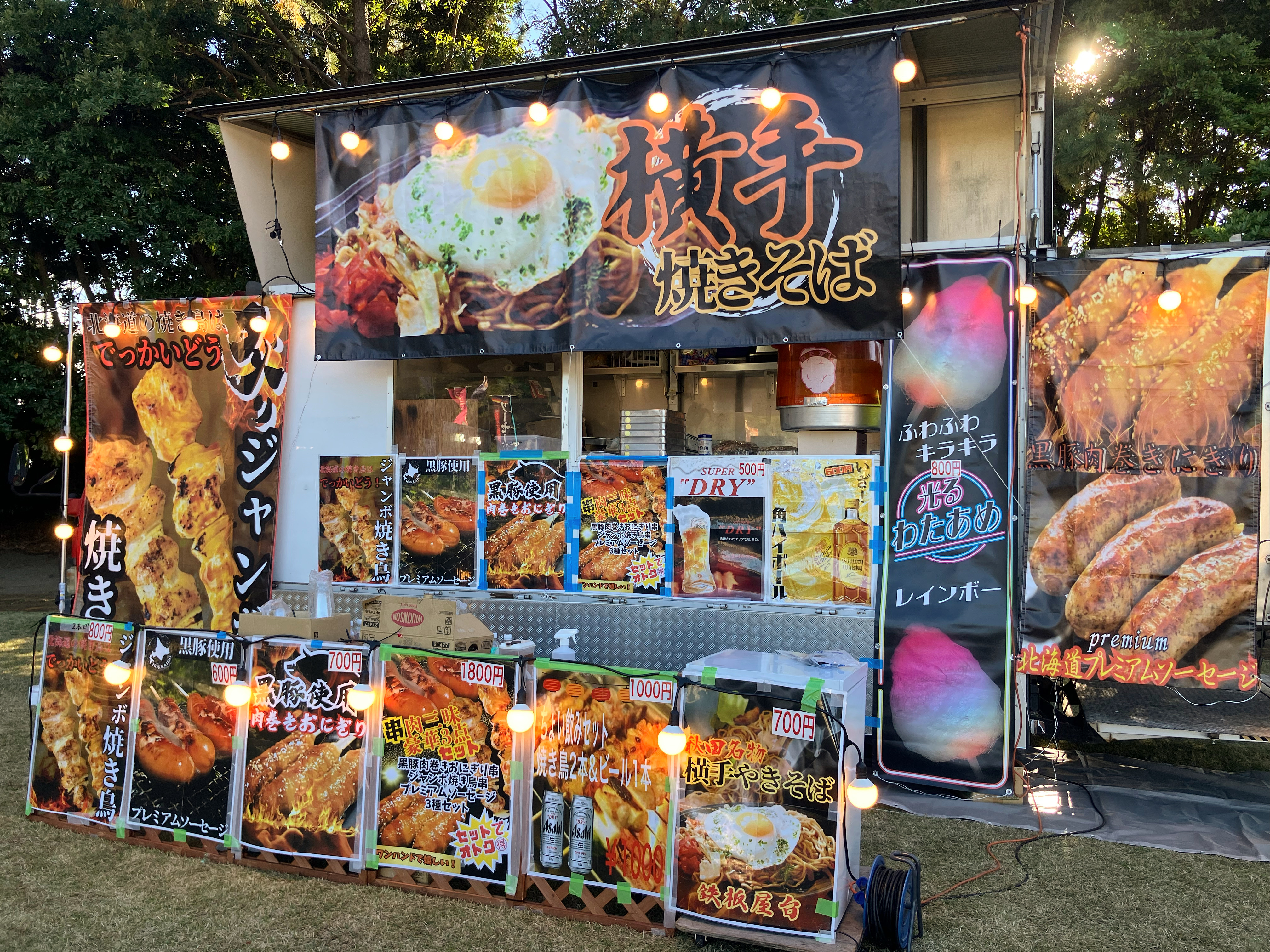 焼きそば 唐揚げ 串焼き ホットドッグ フランクフルト タコス チュロス 光わたあめ カキ氷 苺あめ アヒルのボトルドリンク アルコール