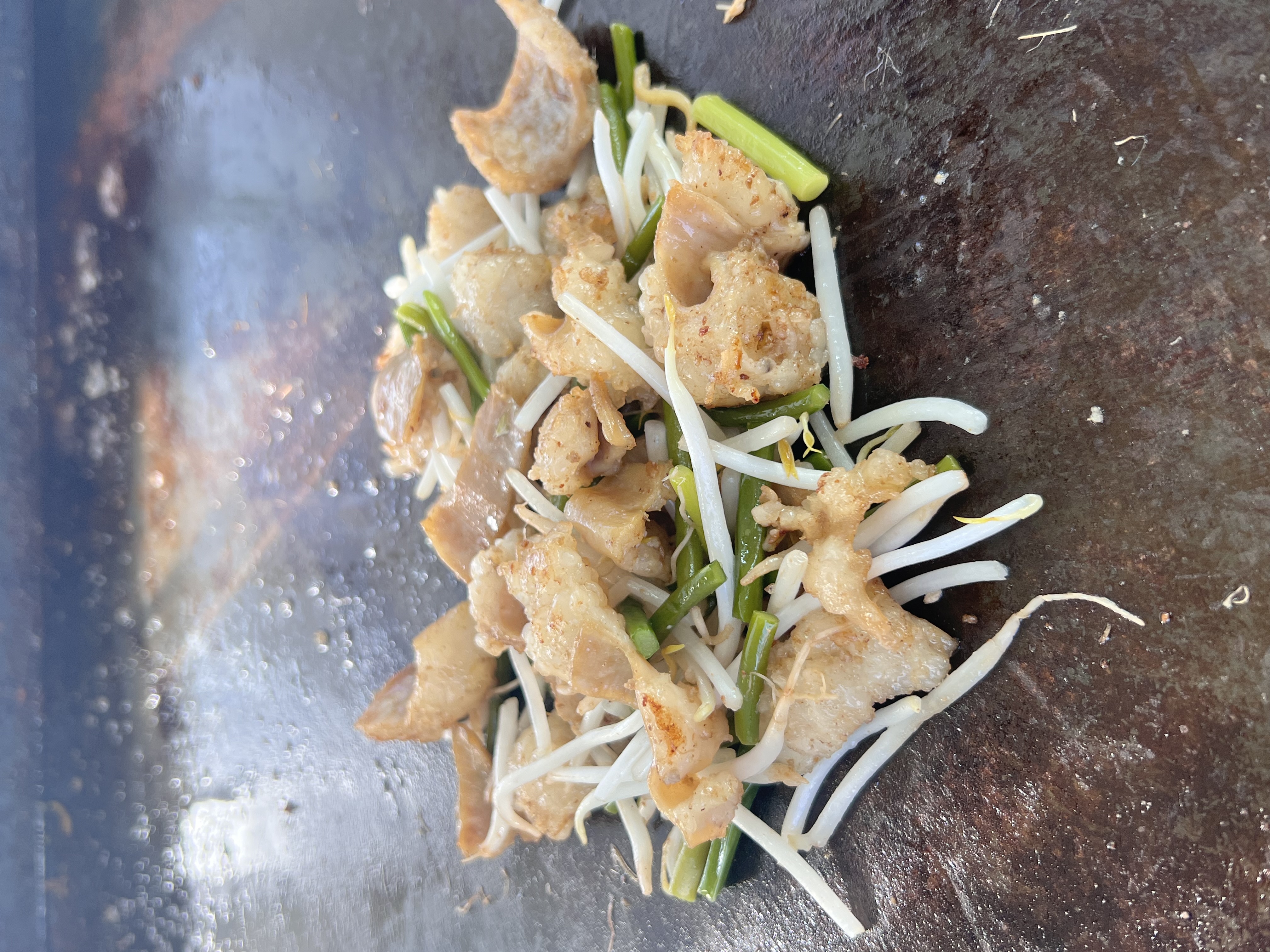 ホルモン焼きそば、クラムチャウダー、ビール、ハイボール