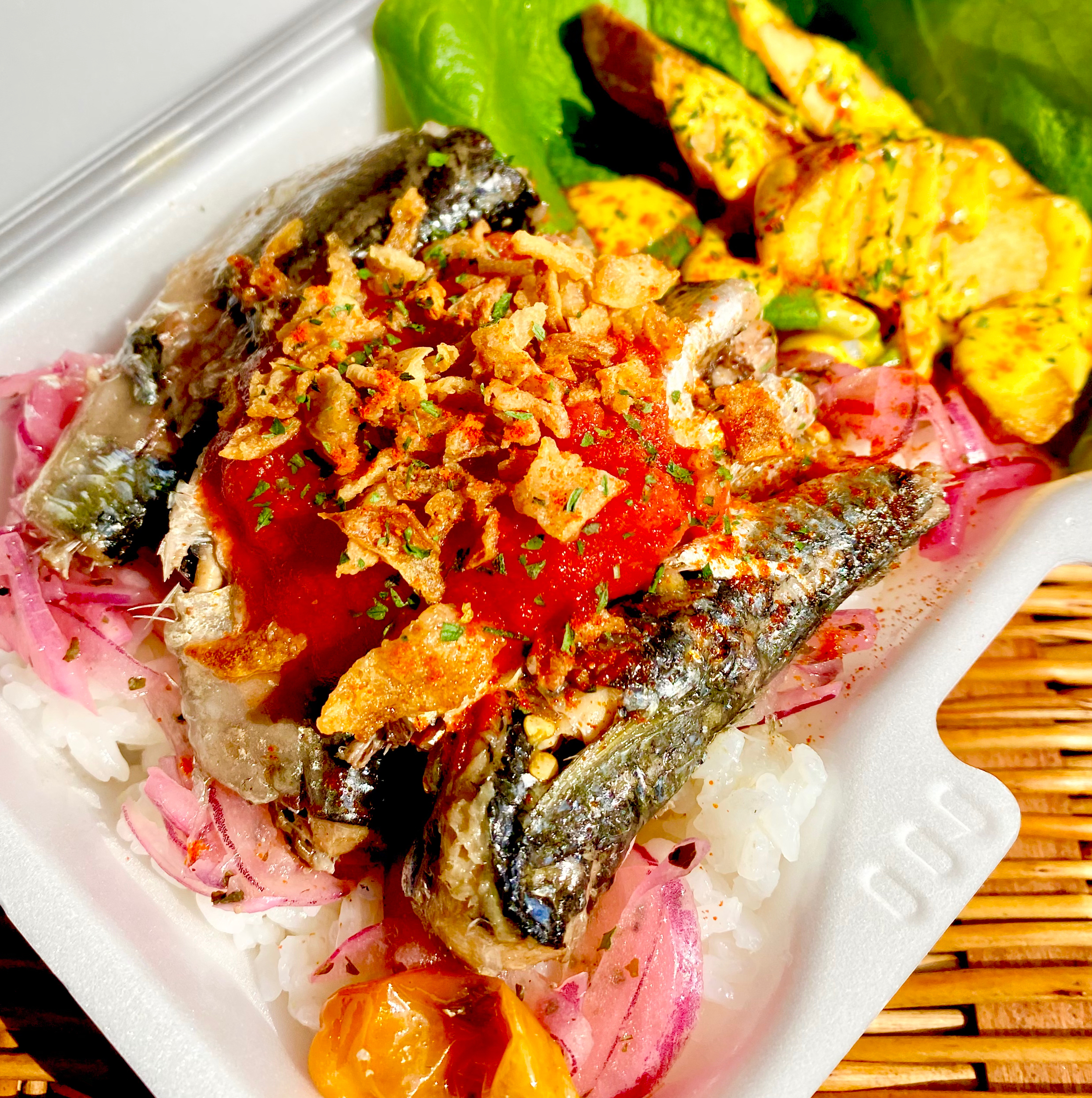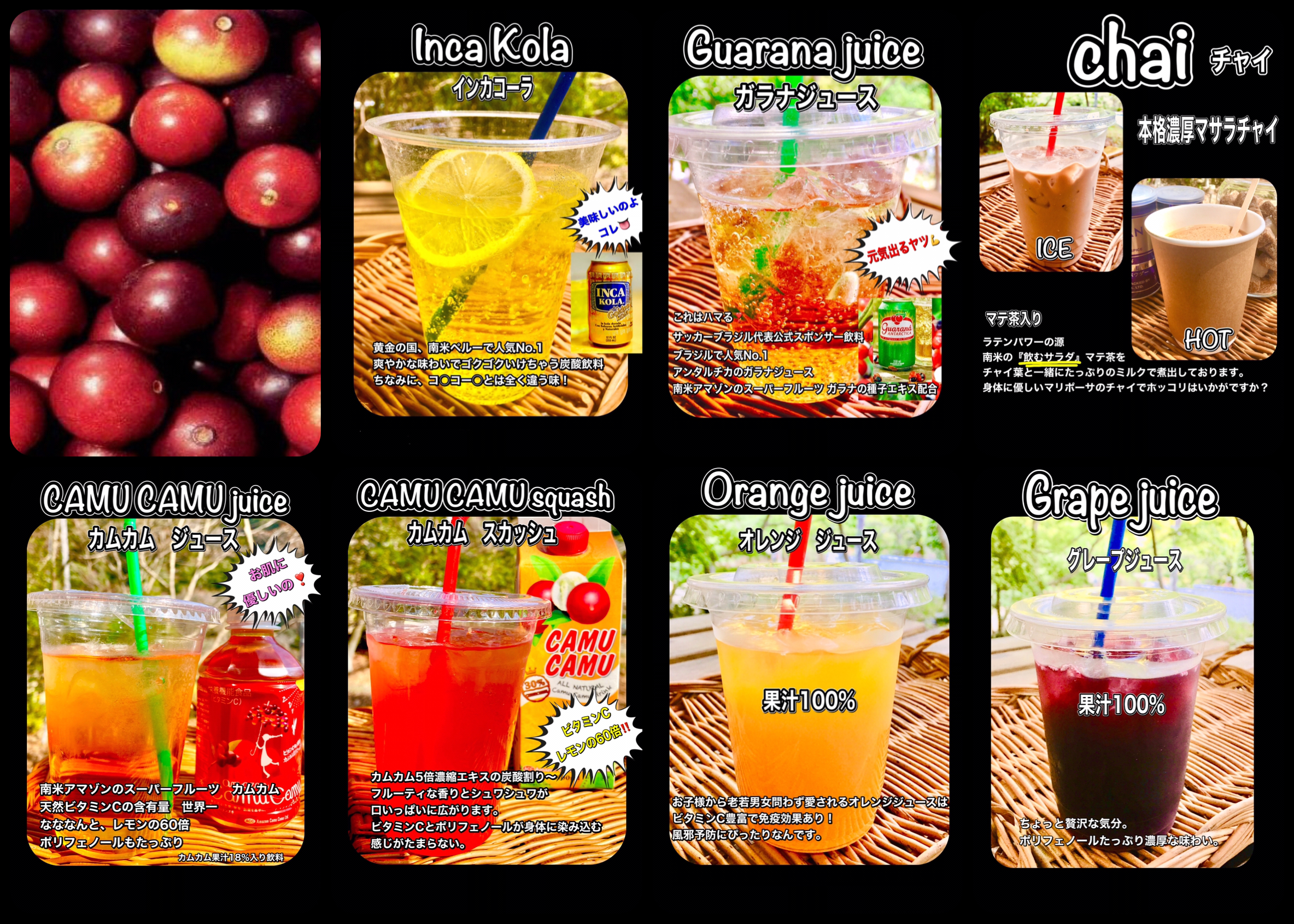 ポンデケージョ、スパイシーチキンライス、オムライス、オイルサーディン丼、南米ジュース等