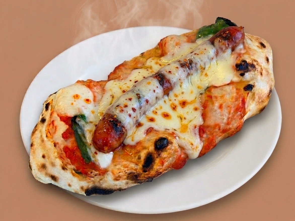 ロングウィンナーやチョリソーを載せた、ボリューム感のあるワンハンドピザドッグ。