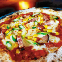 こちらのピザは房総ポークの厚切りベーコンとアスパラガス、スイートコーン のピザ♪地産地消に拘り、房総ポークのベーコンを使用しています。海草粉末 などの専用飼料やストレスを抑えた育て方で、臭みが少なくすっきりとした 旨味の豚肉なのだそう。ベーコンの塩気とアスパラのシャキッとした食感、 コーンで少し甘みを出し、薪窯で燻された生地が掛け合わされた味わいは、 一度食べたら病みつきになりそうです♪