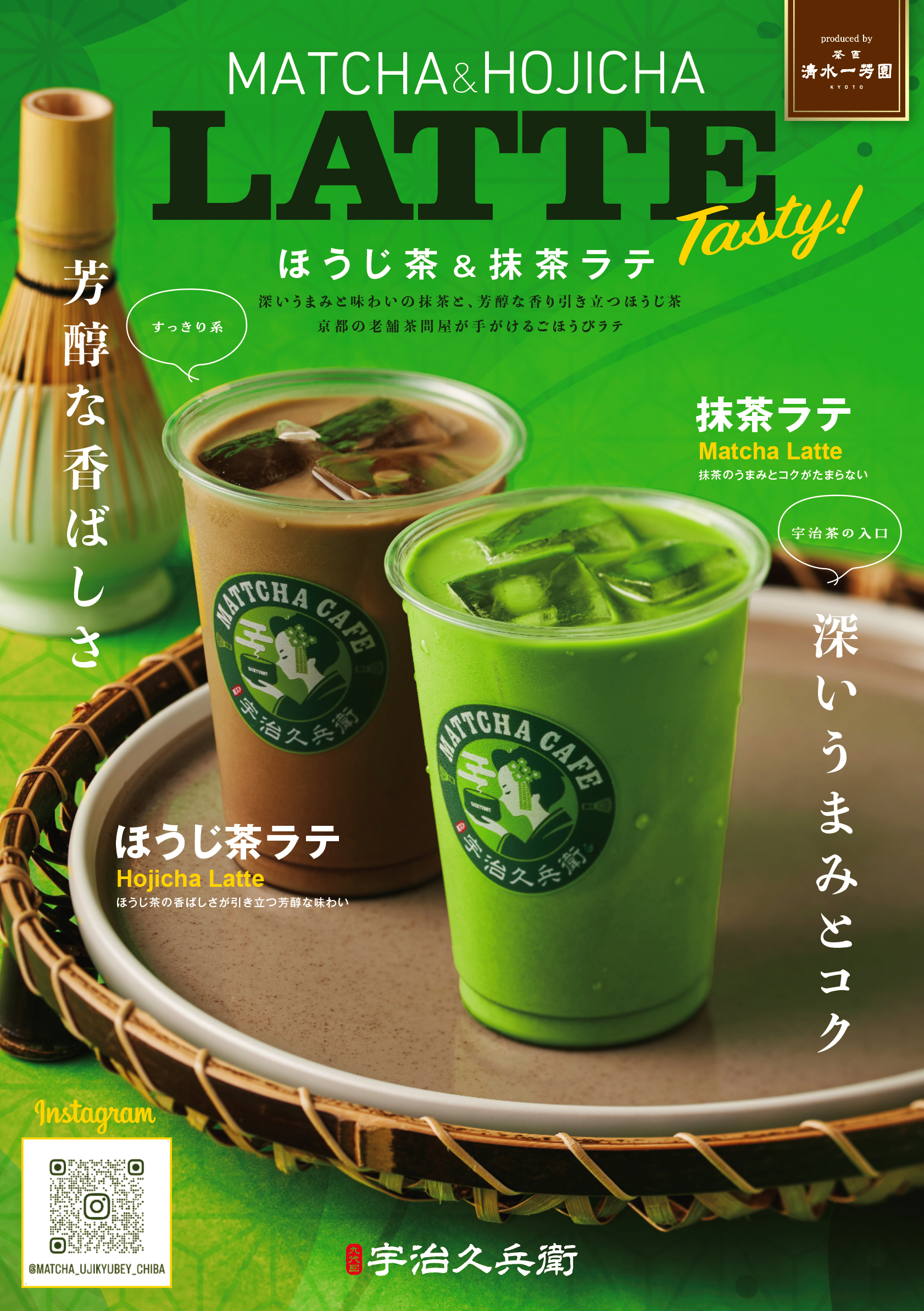 京都宇治抹茶を使用した、ごほうび抹茶ラテと、茶問屋が提供する本格ほうじ茶ラテをお楽しみください。