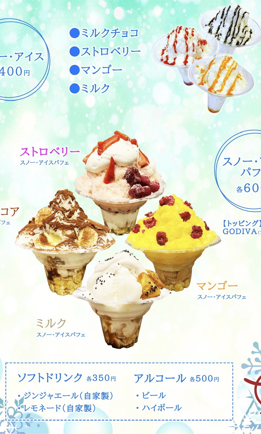 スノーアイス、スノーアイスパフェ、自家製レモネード、自家製ジンジャエール