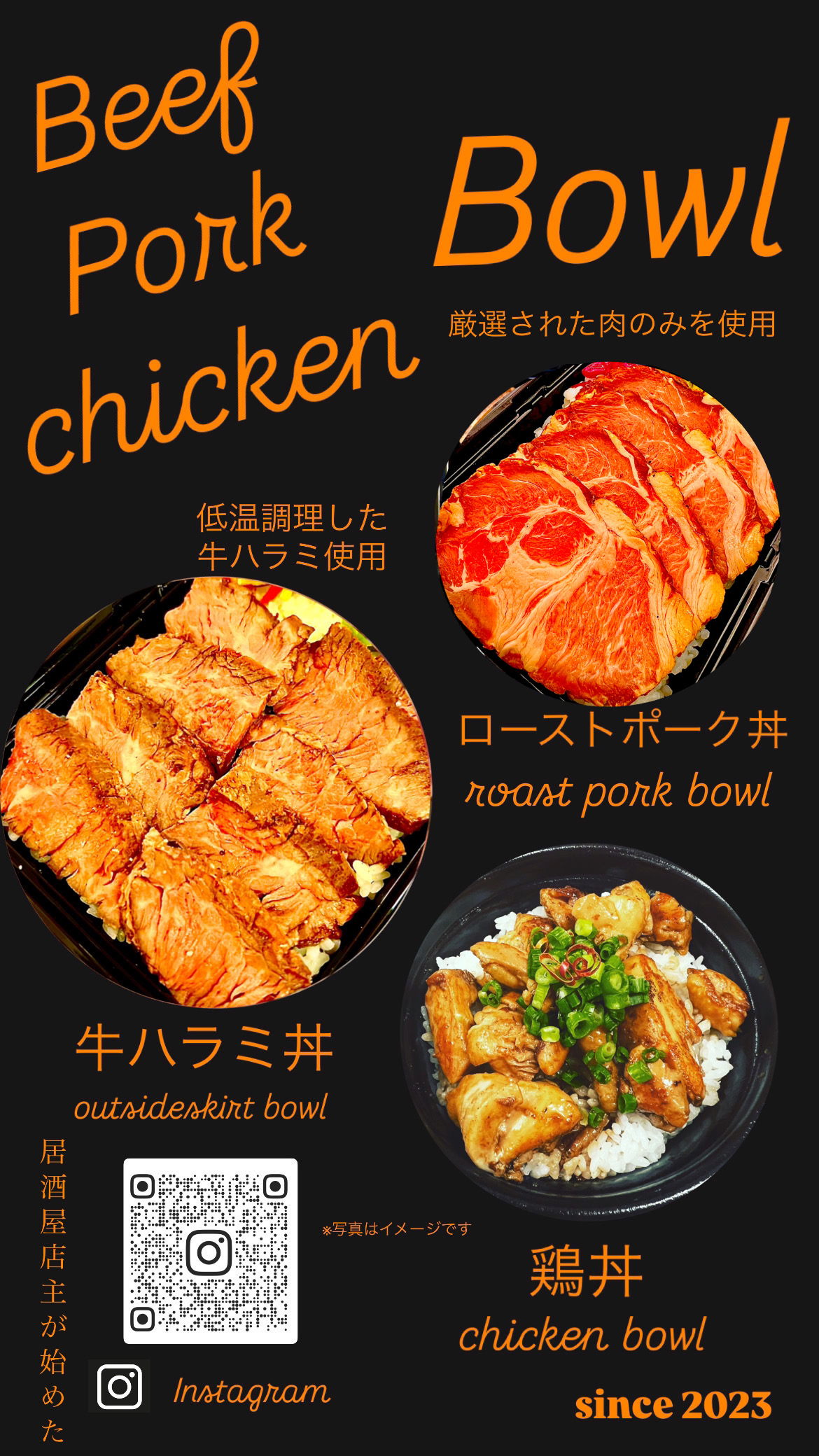 牛串、牛ハラミ丼、ローストポーク丼、鶏丼、数量限定丼、(軽食、パンも対応)スティックパンケーキ、(夏限定シャリシャリいちご)、ソフトドリンク、アルコール