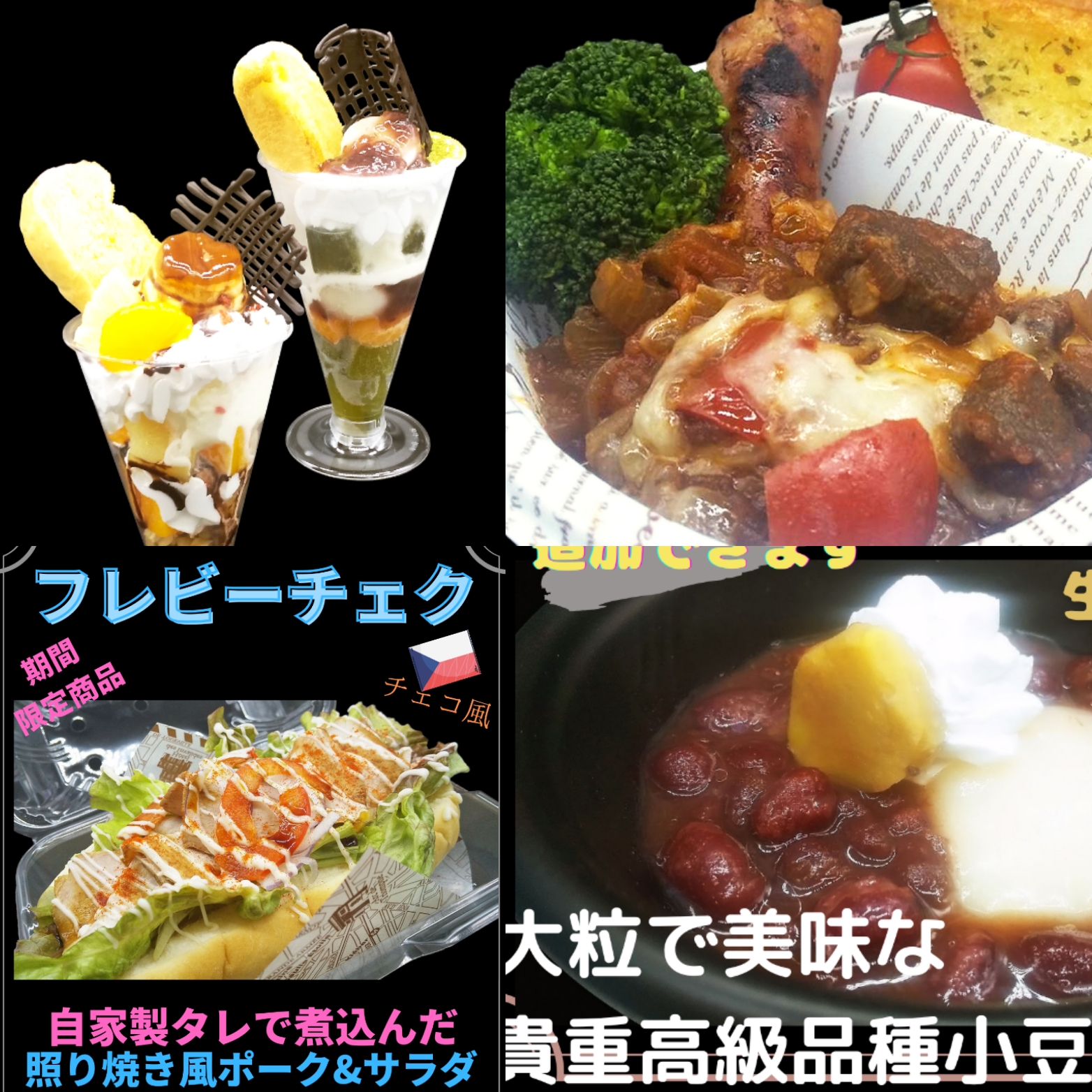 骨つきソーセージドイツ風グヤーシュ、チェコ風オープンサンドイッチ照り焼き&サラダ、丹波大納言小豆ぜんざい、パンパフェ、きな粉パン