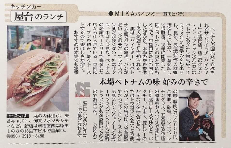 日本でもベトナム料理のお店はたくさんあるけど、美味しいバインミーにはなかなか出会えない。日本でも美味しいバインミーを知って欲しいと、キッチンカーでの営業をスタート。ご両親もベトナムでバインミーの専門店を営んでいるそうで、ミカバインミーでも、その味を引き継いでいます!是非、ここ日本でも、本場の味をお楽しみ下さい♪