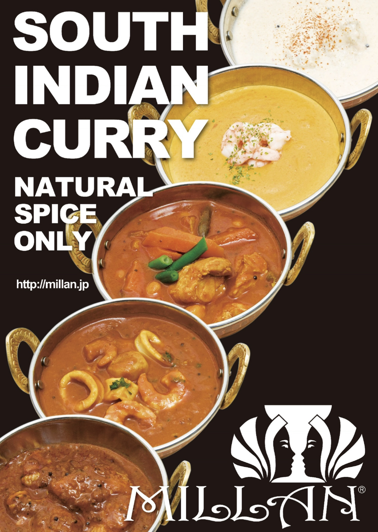 南インドカレー(マサラチキン/大根入りキーマカレー/牡蠣カレー/ココナツチキン/えびのカシューナッツカレー/スパイシーポーク/野菜カレー等全12種より日替わりで5種類) 1種800円2種1,000円