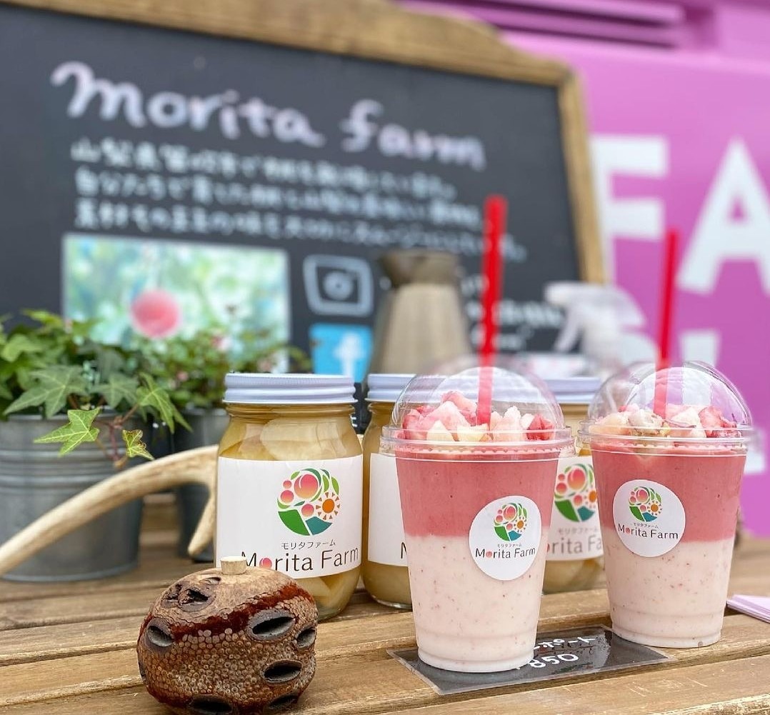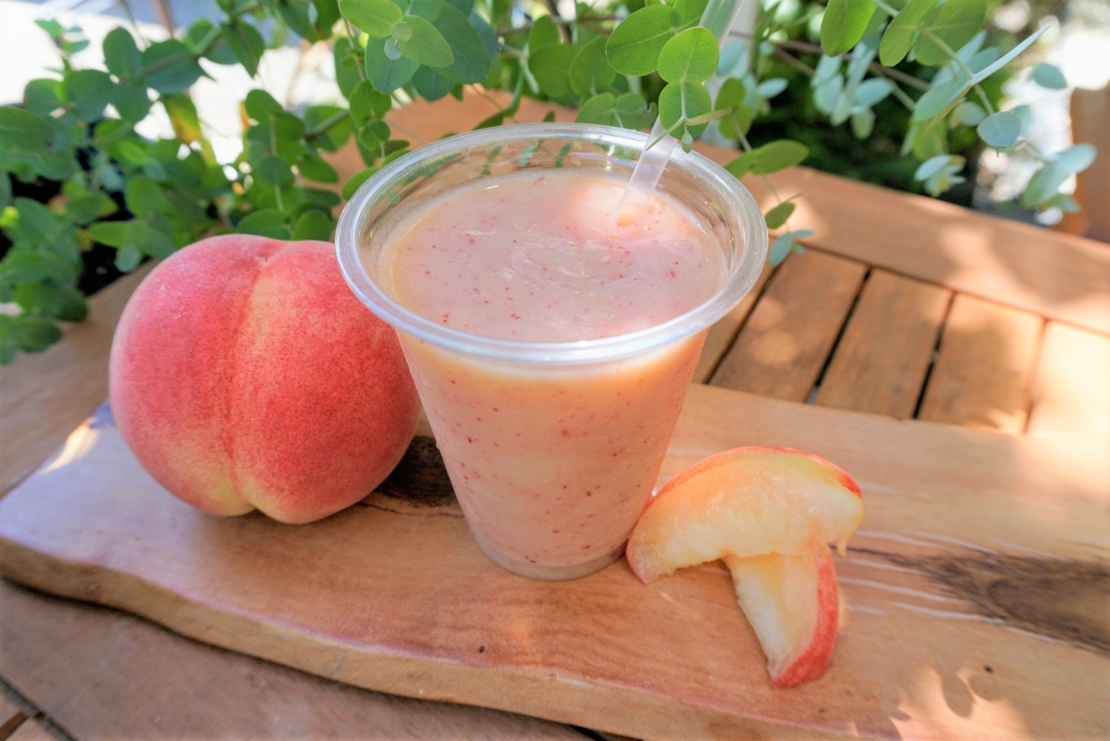 モリタファームは山梨で桃を栽培している農家です。自分たちで育てた桃をスムージーにたっぷりと使っています。一番人気は、当園の桃をまるまるひとつ使った「モモスムージー」。濃厚な桃そのままの美味しさです。