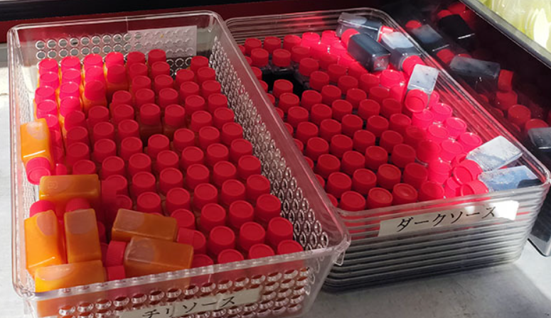 味の決め手となる、当店オリジナルの二種のソース。ダークソース(チキンライス専用の甘い醤油)、チリソース(海南鶏飯の最も重要な部分)二種のソースで好みの味に調合してお召し上がりください!