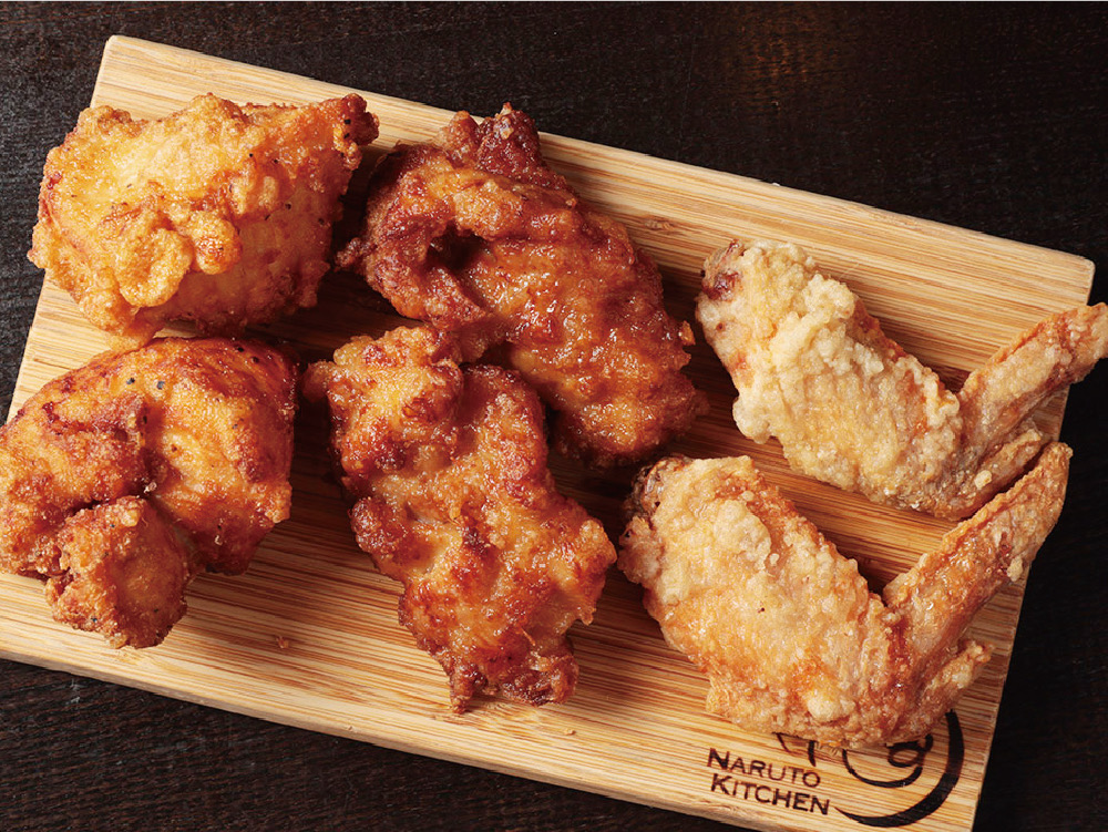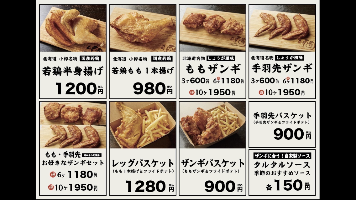 若鳥半身揚げ、若鳥ももザンギ、手羽先、もも一本揚げ、フライドポテト